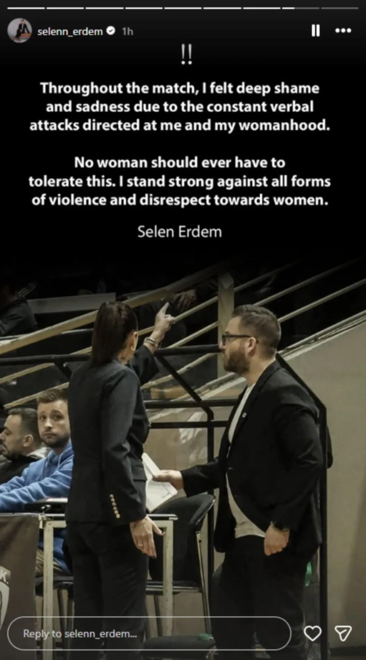 Η Σελέν Ερντέμ με story της στο Instagram εξέφρασε τα παράπονά της για προσβολές που άκουσε από την κερκίδα κατά την αναμέτρηση του Παναθηναϊκού με τον ΠΑΟΚ για την 8η αγωνιστική της Α1 γυναικών.