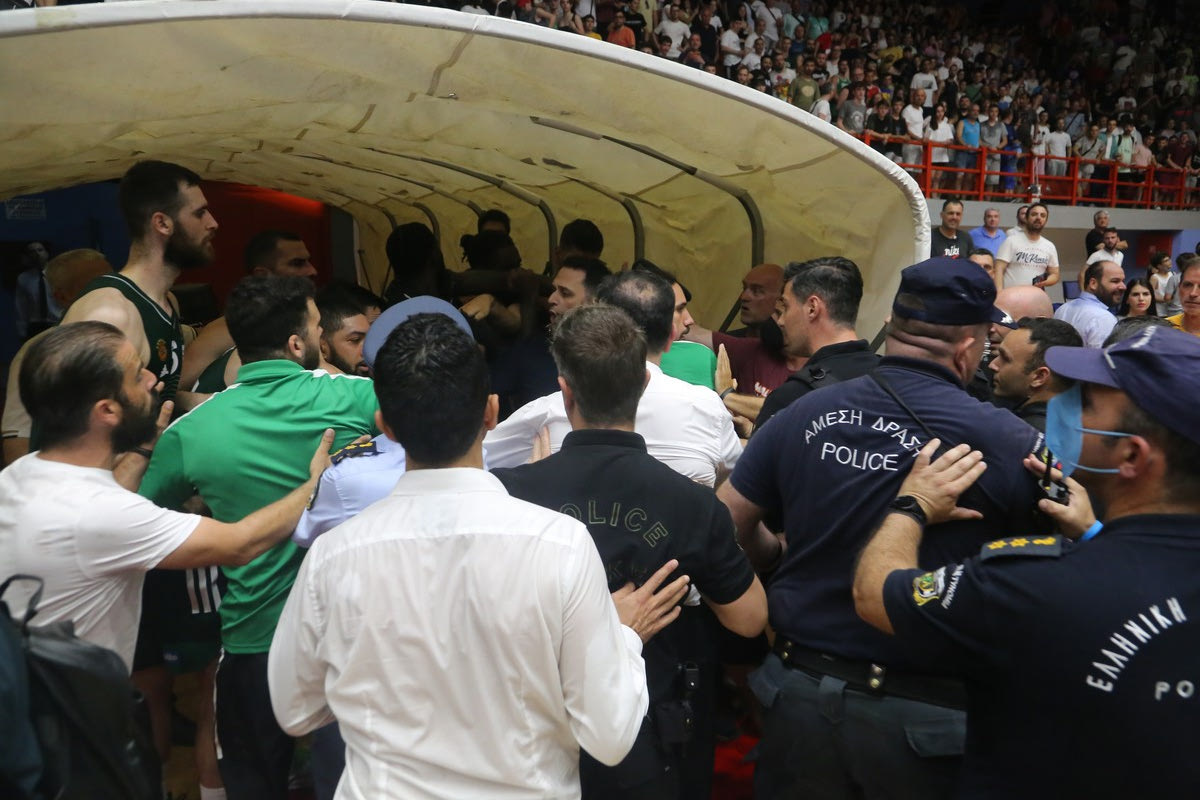 Οι παίκτες και οι προπονητές της ομάδας έτρεξαν γρήγορα προς τα αποδυτήρια. Έχει μείνει ο Γουάιτ ο οποίος τα λέει σε φιλικό ύφος με τον Μάριτς αλλά και ο Μαντζούκας.
