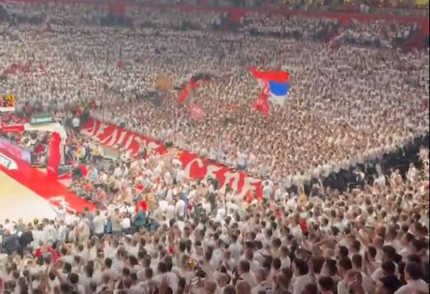 Η Stark Arena μαγνήτισε τα βλέμματα πριν το τζάμπολ του ντέρμπι του Ερυθρού Αστέρα με την Παρτίζαν για την 19η αγωνιστική της EuroLeague. Οι φίλοι των ερυθρόλευκων κατέκλισαν τις κερκίδες με λευκά μπλουζάκια και δεν σταμάτησαν να τραγουδούν στιγμή, δημιουργώντας μια εκκωφαντική βοή που έφτασε μέχρι τον αγωνιστικό χώρο.