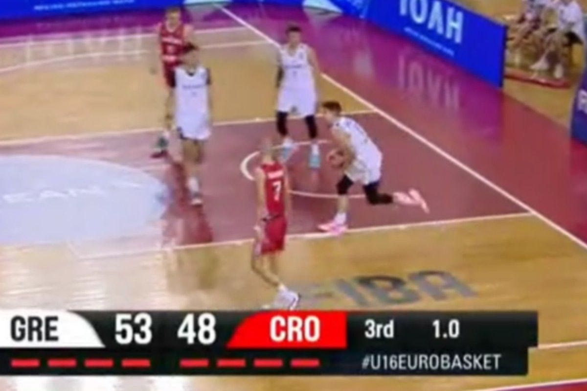 Ένα συγκλονιστικό τρίποντο από τη μία άκρη του γηπέδου στην άλλη πέτυχε ο Χρυσόστομος Χατζηλάμπρου στο φινάλε της τρίτης περιόδου του αγώνα της Εθνικής Παίδων με την Κροατία για τη 2η αγωνιστική της φάσης των ομίλων του EuroBasket U16 που διεξάγεται στο Ηράκλειο.