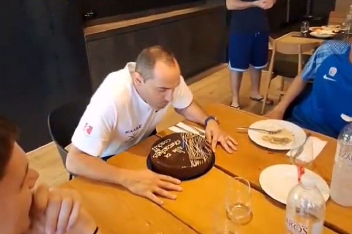 Κατά τη διάρκεια ενός γεύματος στο ξενοδοχείο της αποστολής, οι συνεργάτες και οι αθλητές του Γιάννη Καλαμπόκη, τού επιφύλασσαν τούρτα-έκπληξη για τα γενέθλιά του μία ημέρα πριν από τον ημιτελικό της “γαλανόλευκης” με την Ισπανία (16/8, 18:30). Μάλιστα, το “κοουτσάρα, κοουτσάρα” ήχησε στην αίθουσα, αφού ο 46χρονος, πλέον, ομοσπονδιακός τεχνικός έσβησε τα κεράκια.
