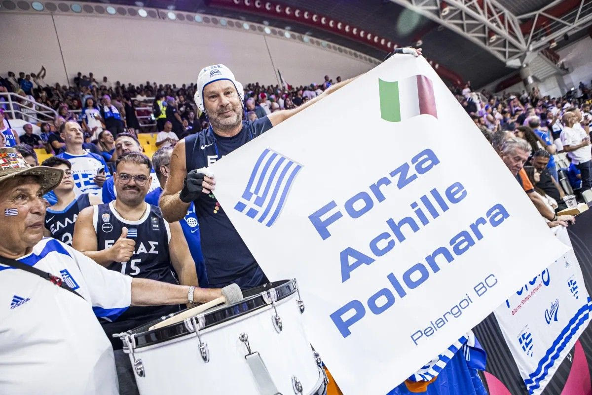 Υπέροχη κίνηση από τους Έλληνες φιλάθλους, που δημιούργησαν πανό με τον Ακίλε Πολονάρα για το παιχνίδι της Εθνικής κόντρα στην Ιταλία στην πρεμιέρα των δύο ομάδων στο EuroBasket 2025 (ΕΡΤ NEWS, Novasports Start, Match Center από το SPORT24), ενώ τραγούδησαν ρυθμικά και το όνομά του.