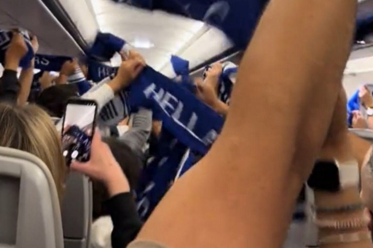 Ήδη στα Social Media έχουν κάνει την εμφάνισή τους τα πρώτα VIDEO, που αποτυπώνουν πλήρως το κλίμα που επικρατεί στις τάξεις των Ελλήνων. “Δεν σταματώ να τραγουδώ ποτέ” τραγουδούν μέσα στο τσάρτερ, δίνοντας το δικό τους χρώμα με τα κασκόλ της Εθνικής Ελλάδας.