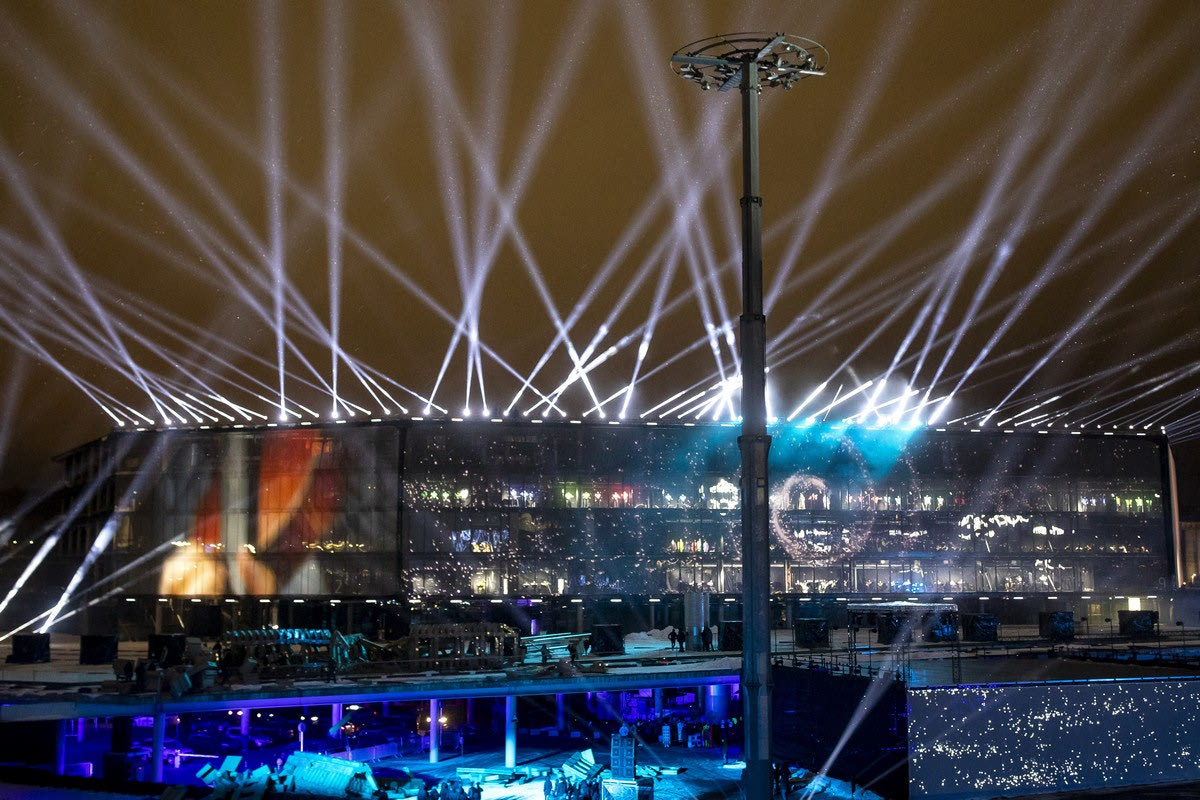 Projectors illuminate the sky during the Act I of The Contemporary Myth of Kaunas Trilogy, "The Confusion", on the river Nemunas island, near Zalgirio Arena during the opening ceremony of the European Capital of Culture in Kaunas, Lithuania, Saturday, Jan. 22, 2022. Kaunas became European Capital of Culture on January 22 with two other cities: Novi Sad (Serbia) and Esch-sur-Alzette (Luxembourg) after a yearlong delay caused by the coronavirus pandemic. (AP Photo/Mindaugas Kulbis)