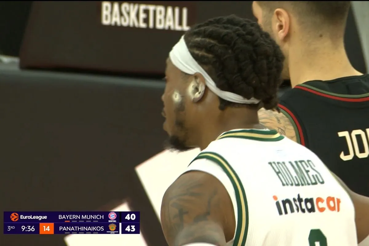 Η εμφάνιση του Ρισόν Χολμς με αιμοστατικό σπρέι στο μάγουλο και το αφτί στην εκκίνηση του δεύτερου μέρους της αναμέτρησης Μπάγερν – Παναθηναϊκός AKTOR για την 22η αγωνιστική της EuroLeague.