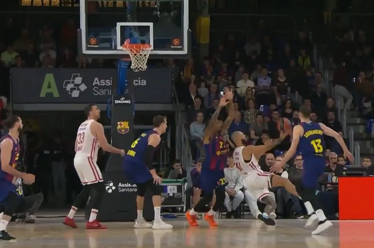 Τρελό καλάθι από τον Εβάν Φουρνιέ στο ματς Μπαρτσελόνα – Ολυμπιακός, με τον Γάλλο να σκοράρει με την πλάτη στο καλάθι και πέφτοντας στο παρκέ, υπό την πίεση του Γουίλ Κλάιμπερν.