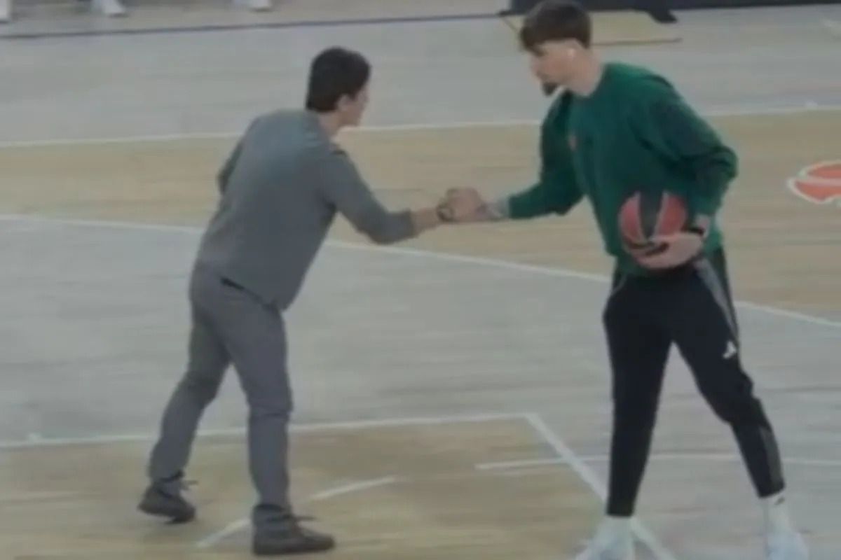 Ο ιδιοκτήτης της πράσινης ΚΑΕ μπήκε μάλιστα στο παρκέ και χαιρέτησε ένα ένα τα μέλη της πράσινης αποστολής που βρίσκονταν έξω.