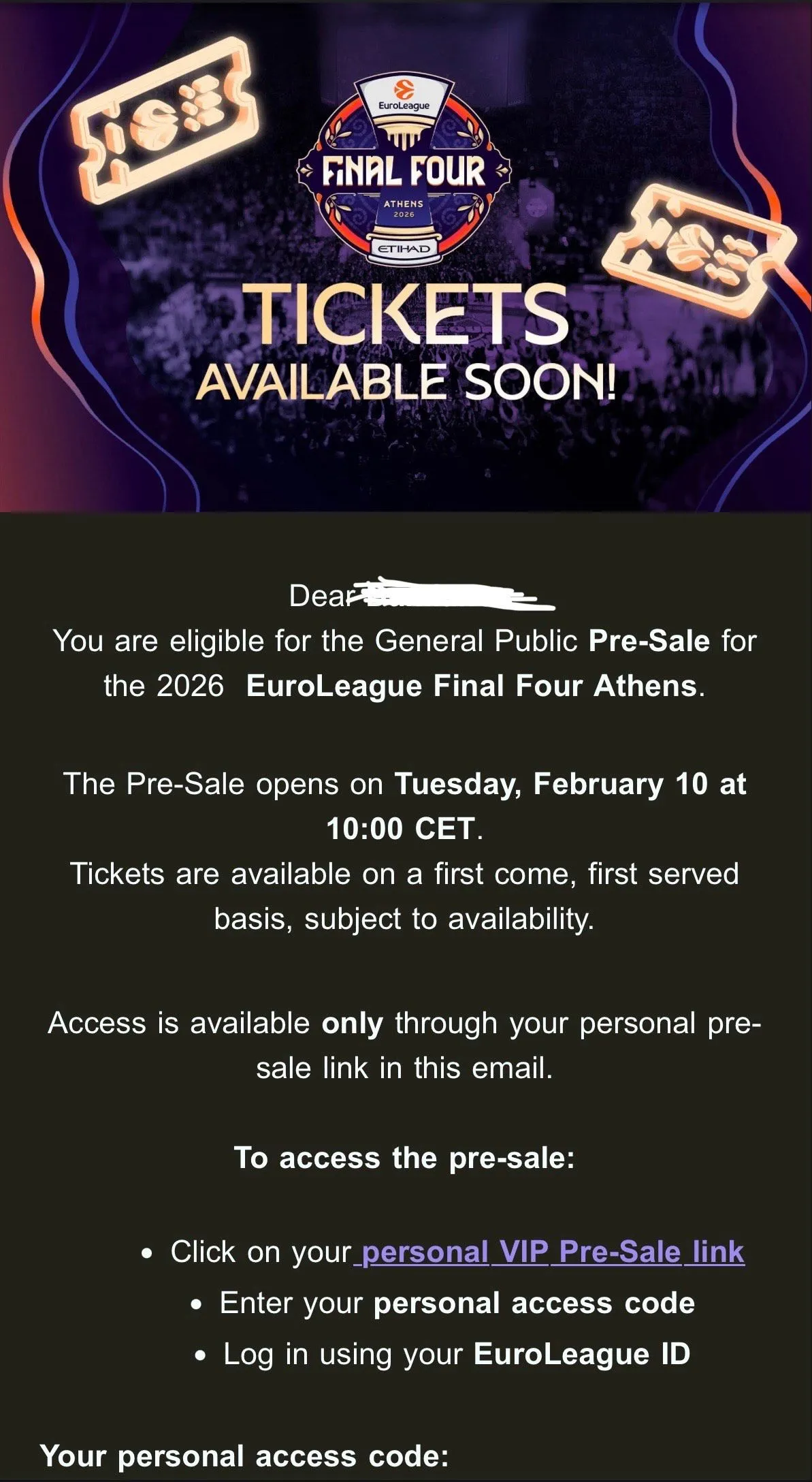 Αυτό το email έλαβαν το απόγευμα της Δευτέρας (9/2) οι οπαδοί που μπορούν να επωφεληθούν από το pre-sale για τα εισιτήρια του EuroLeague Final Four 2026.