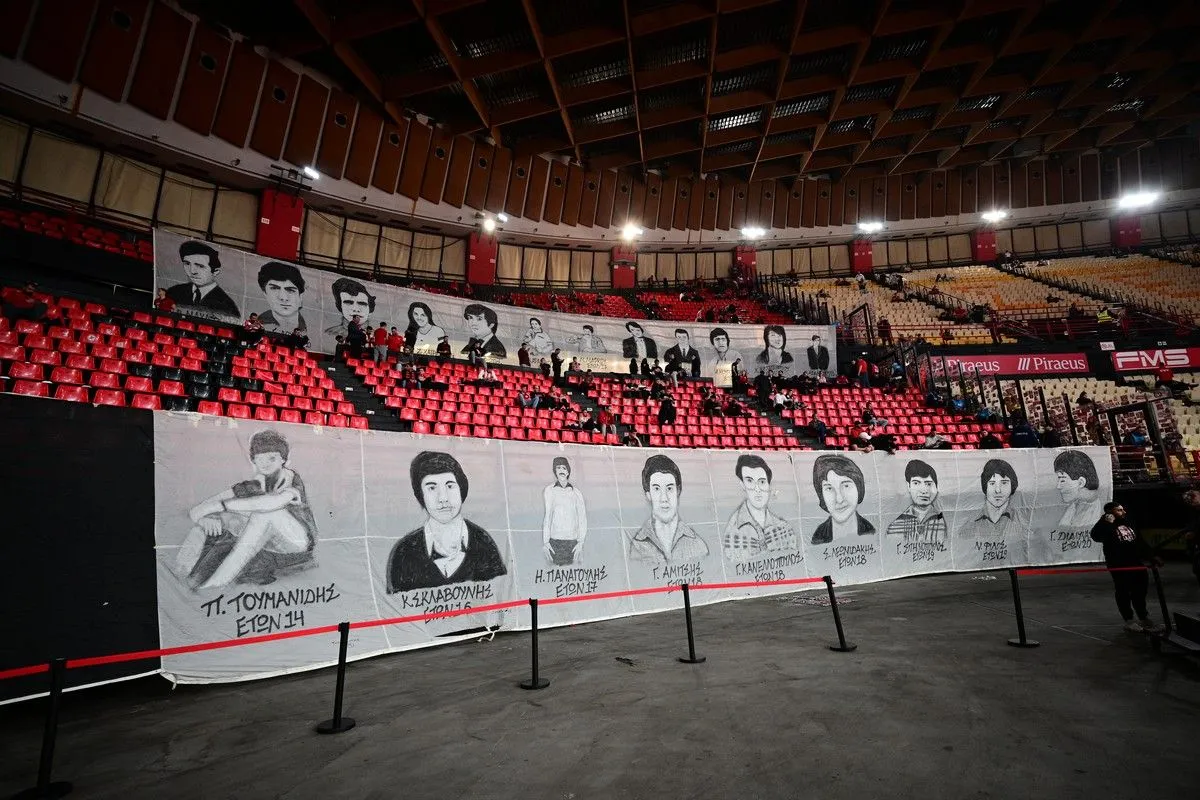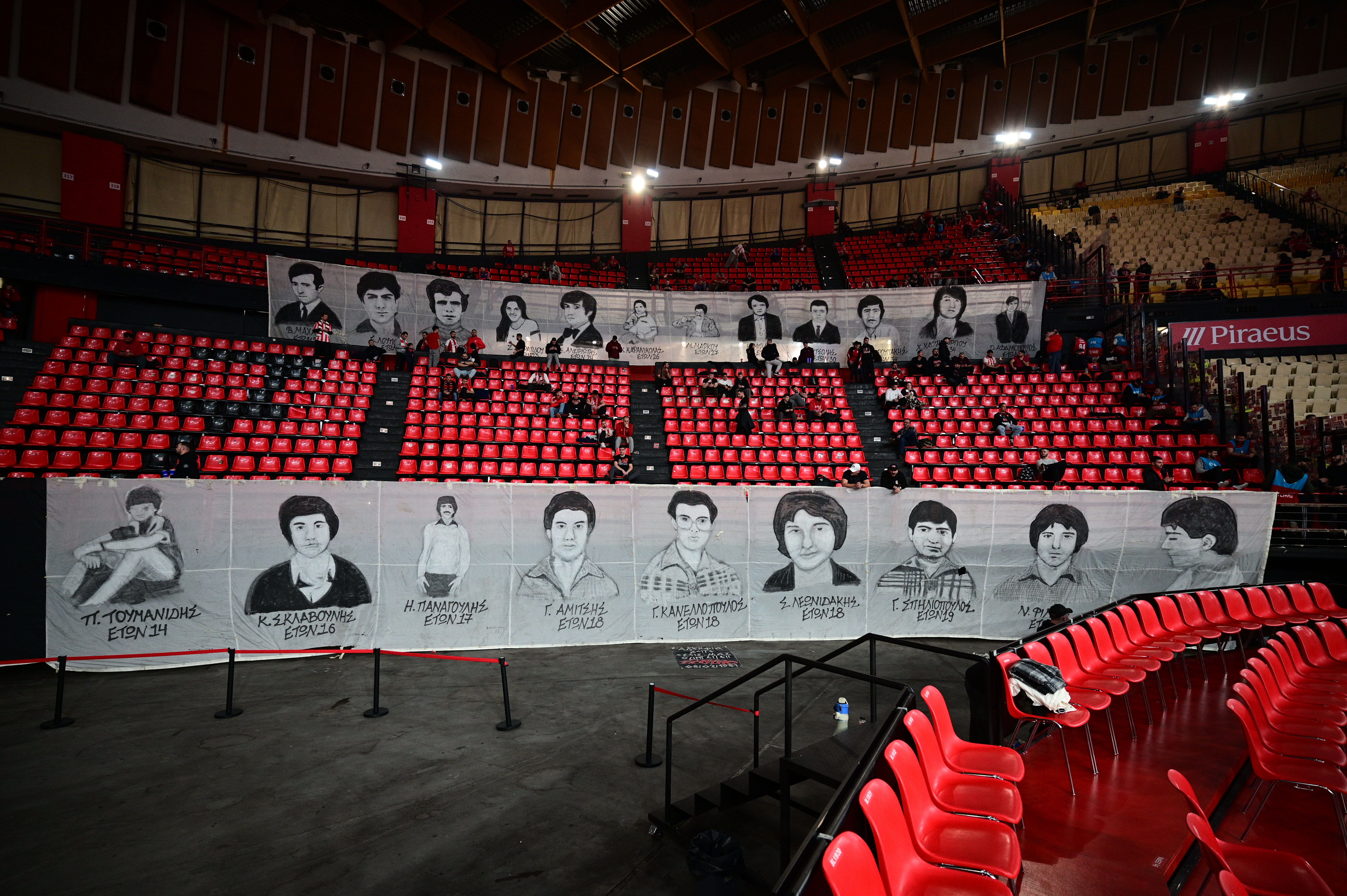 Οι φίλοι των ερυθρολεύκων ανάρτησαν δύο πανό στη μνήμη των θυμάτων της θύρας 7 πριν την αναμέτρηση του Ολυμπιακού με τη Βίρτους για την 27η αγωνιστική της EuroLeague.