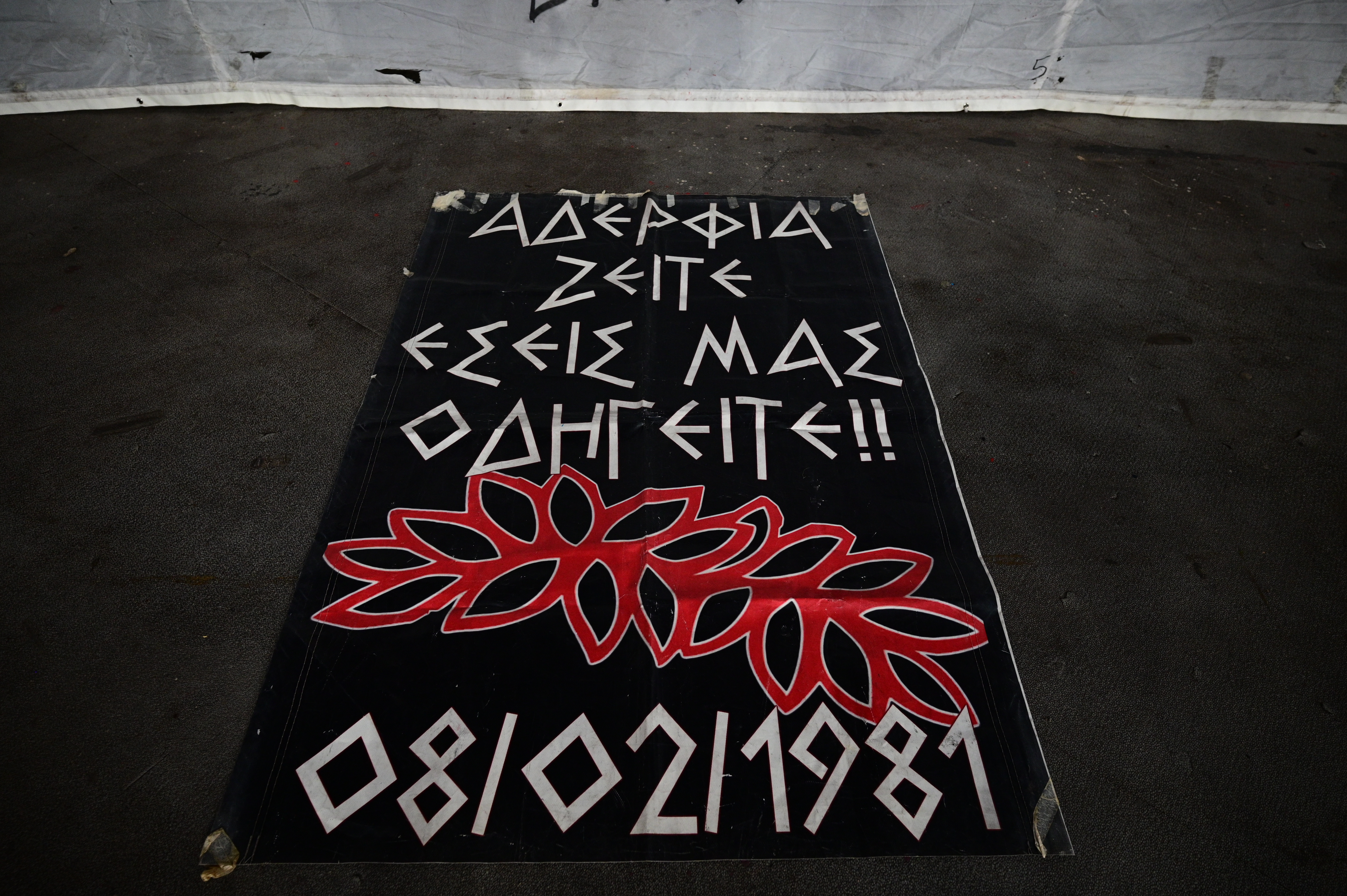 Πριν την έναρξη της αναμέτρησης οι φίλοι των ερυθρολεύκων ανάρτησαν δύο πανό με τα πρόσωπα των θυμάτων της θύρας 7.