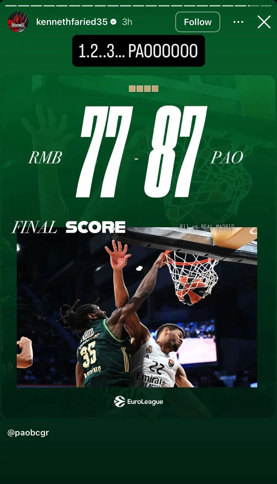 Λίγο μετά την επιστροφή της ομάδας στην Αθήνα, ο Φαρίντ συνέχισε στο ίδιο μοτίβο και με ποστάρισμα στα social media, ανεβάζοντας το καθιερωμένο “ζντο” των “πρασίνων” και γράφοντας χαρακτηριστικά: “1, 2, 3, PAOOOOOO”.