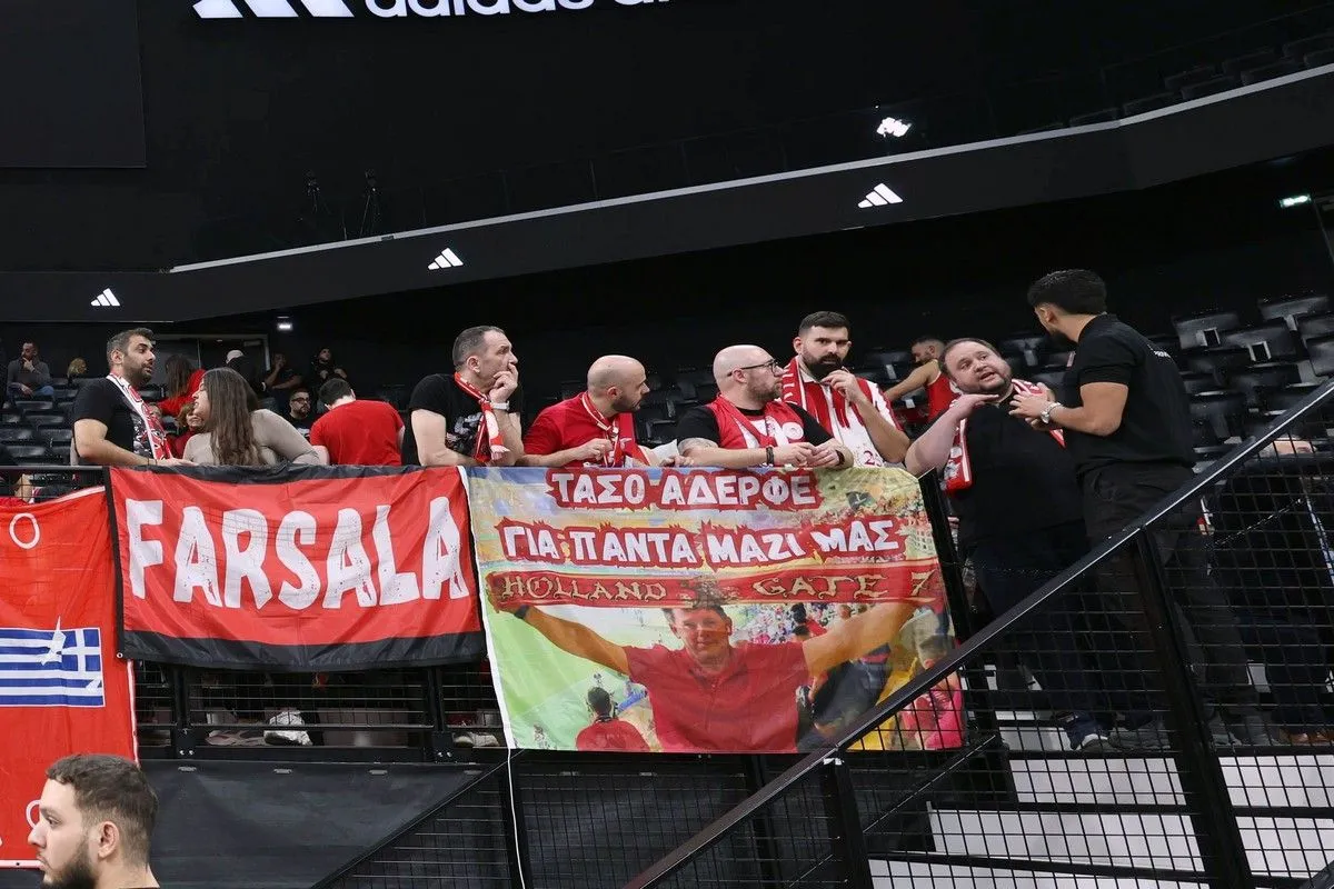 Εκτός από τα πανό με τα τρόπαια των 101 ετών των Πειραιωτών έχουν υψώσει και ένα πανό για τον Τάσο, έναν φίλο του Ολυμπιακού από το Άμστερνταμ που είχε κλείσει τη θέση του για την αποψινή αναμέτρηση, όμως έφυγε από τη ζωή πριν από δύο ημέρες.