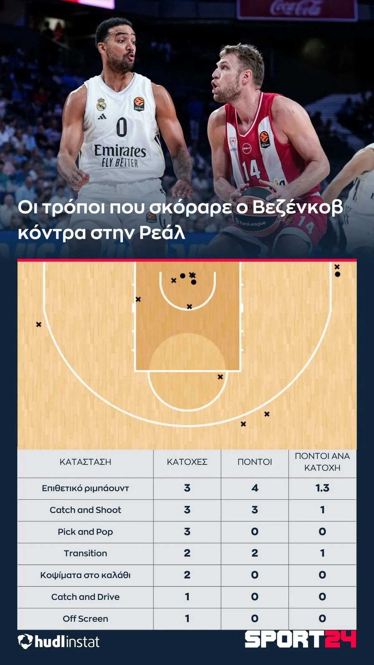 *Με κυκλάκι τα εύστοχα σουτ, με “x” τα άστοχαΟ Βεζένκοβ δεν βρήκε χώρους. Και δεν βρήκε χώρους επειδή η Ρεάλ δεν ήθελε να τον αφήσει να το κάνει αυτό. Μόλις στην 2η επίθεση του Ολυμπιακού φάνηκε το πλάνο της Ρεάλ, όταν έγινε το εξής: