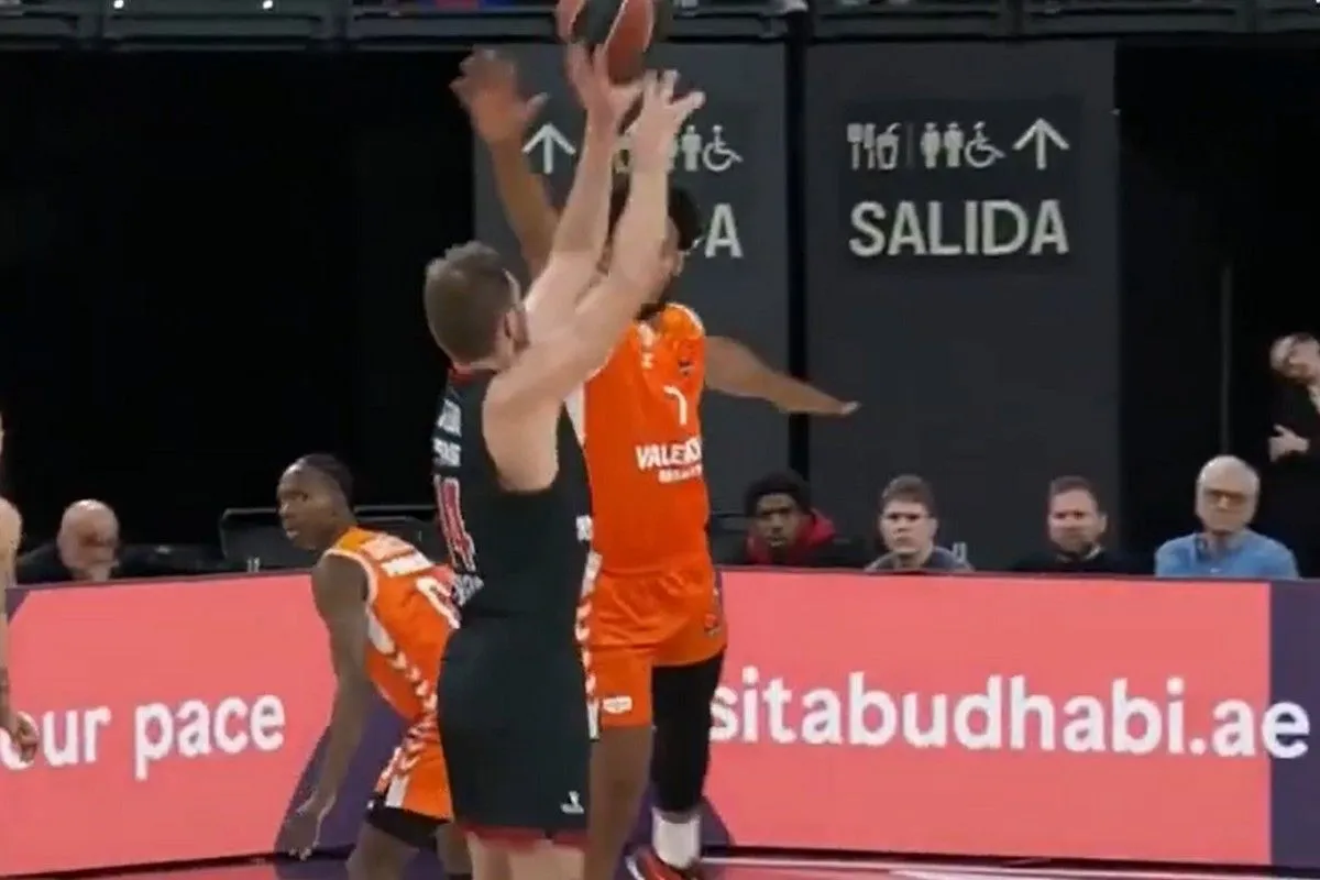 Ο Σάσα Βεζένκοβ πέτυχε ένα πολύ δύσκολο τρίποντο από τα 8 μέτρα με άμυνα απέναντι στη Βαλένθια. Επιφώνημα θαυμασμού από τους φίλους της στη Roig Arena.