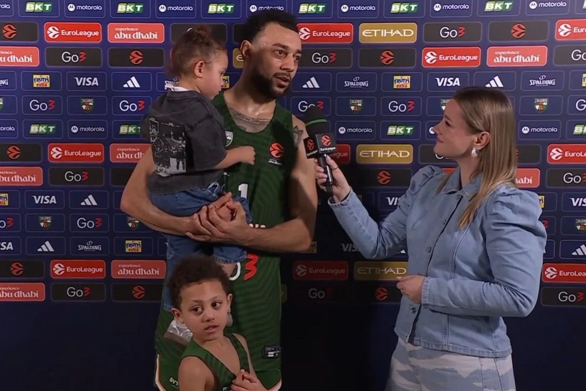 Ο Νάιτζελ Γουίλιαμς-Γκος εμφανίστηκε με τα δύο παιδιά του στη σύντομη συνέντευξη μετά τη νίκη της Ζάλγκιρις επί του Ολυμπιακού για την 29η αγωνιστική της EuroLeague.
