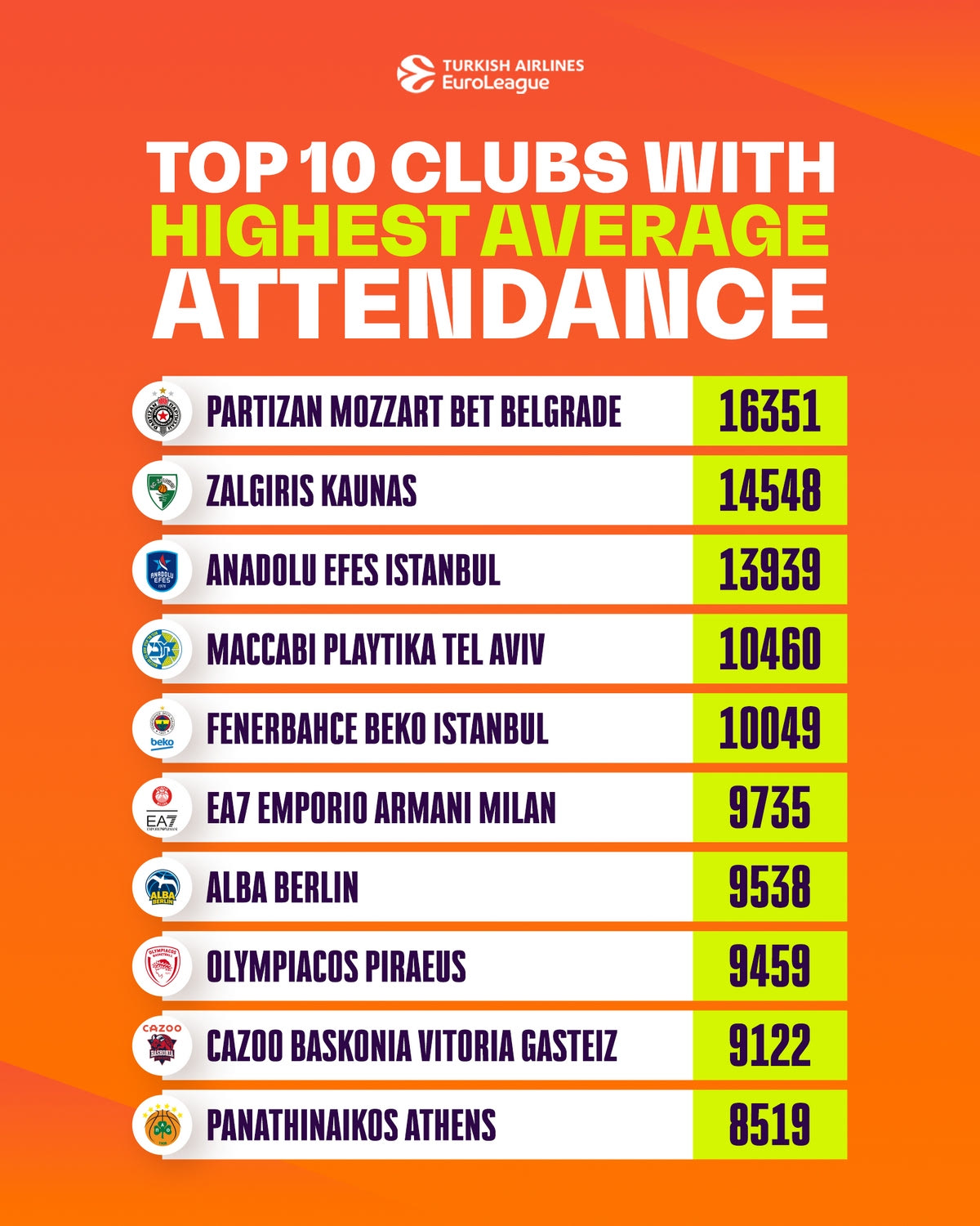 Ειδάλλως τους ευρωπαϊκούς αγώνες της δεν θα τους έβλεπαν κοντά στις 16.500 θεατές ανά φορά. Μάλιστα η Παρτίζαν άφησε πίσω τη Ζάλγκιρις, που παρόλα αυτά με περισσότερους από 14.500 στις εξέδρες διεκδικεί σχεδόν το απόλυτο.