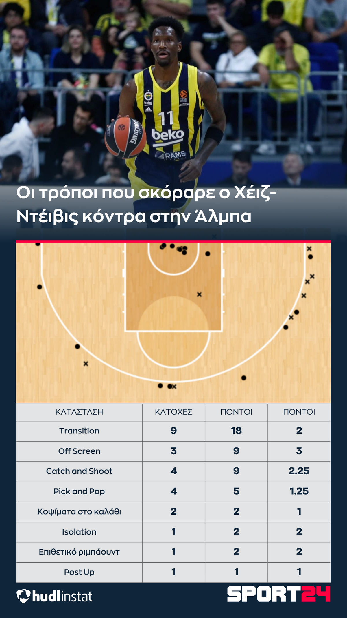 Το SPORT24 αναλύει με την βοήθεια του Hudl Instat την απίστευτη 50αρα του Νάιτζελ Χέιζ-Ντέιβις στην νίκη της Φενέρμπαχτσε επί της Άλμπα Βερολίνου. Οι πόντοι στο ανοιχτό γήπεδο, το πολύπλευρο παιχνίδι του και οι συμπαίκτες του που πιστώθηκαν τις περισσότερες ασίστ.