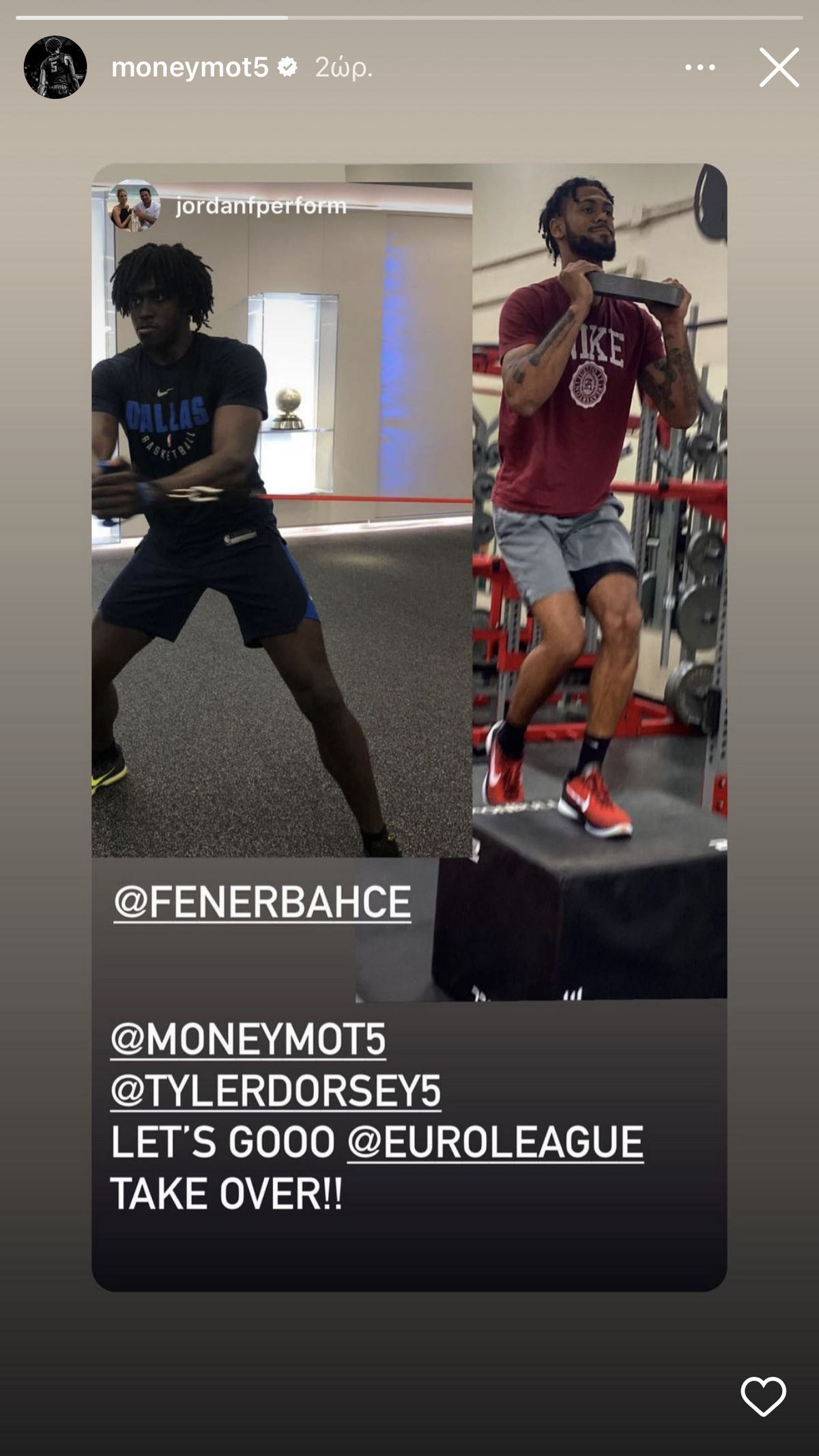 Ο ψηλός της Φενέρμπαχτσε δημοσίευσε στα stories του στο Instagram το post του Τζορνταν Φεραμίσκο – που είναι προσωπικός γυμναστής του Μότλι, αλλά και του Ντόρσεϊ – το οποίο είχε σε φωτογραφία τους δύο παίκτες και ανέφερε: “Φενέρμπαχτσε, Μότλι και Ντόρσεϊ, ας κυριαρχήσουμε στην EuroLeague!!”
