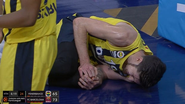 Ο περιφερειακός της τουρκικής ομάδας συγκρούστηκε γόνατο με γόνατο με τον Νικ Καλάθη, σε μια φάση που τον κράτησε για αρκετά δευτερόλεπτα στο παρκέ. Με τη βοήθεια του Μάρκο Γκούντουριτς, πήγε στον πάγκο, το μείζον όμως είναι πως μια αγωνιστική πριν από το τέλος της regular season, η Φενέρμπαχτσε βλέπει δύο πολύ σημαντικά όπλα της να λαβώνονται.