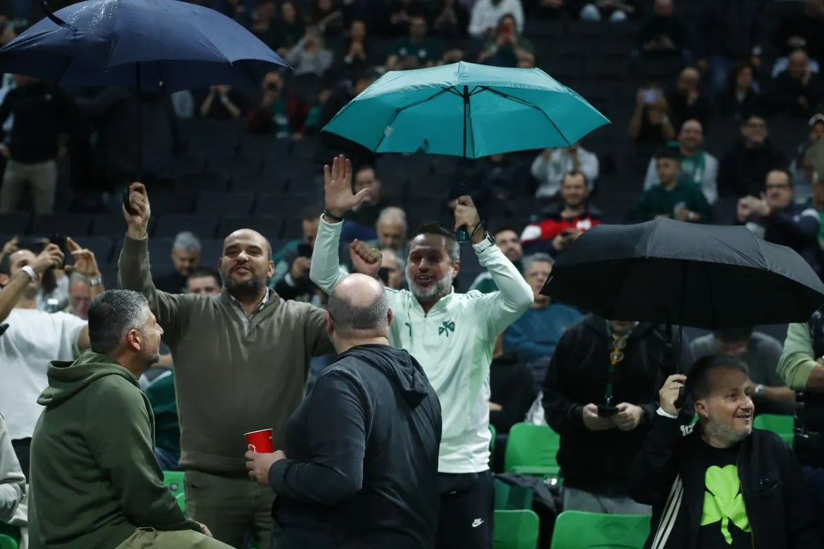 Φίλοι του Παναθηναϊκού άνοιξαν ομπρέλες μέσα στο Telekom Athens Center