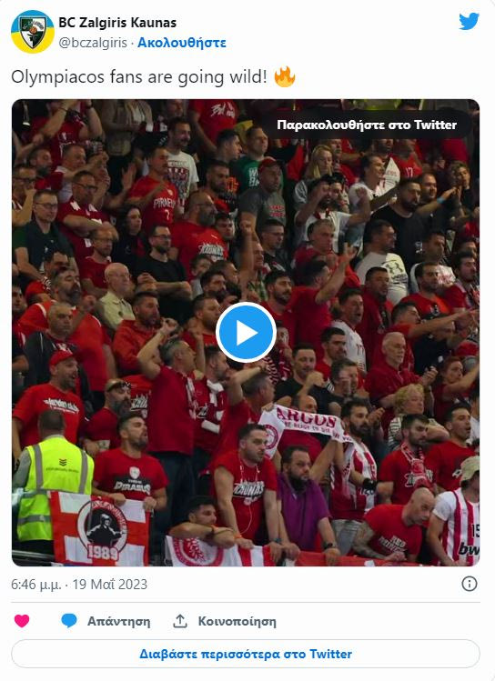 Tweet με τους φίλους του Ολυμπιακού που έκαναν πάρτι στις κερκίδες της Ζαλγκίριο Αρένα κατά τη διάρκεια του ημιτελικού του Final Four 2023 ανάμεσα στους ερυθρόλευκους και τη Μονακό έκανε η Ζάλγκιρις Κάουνας.