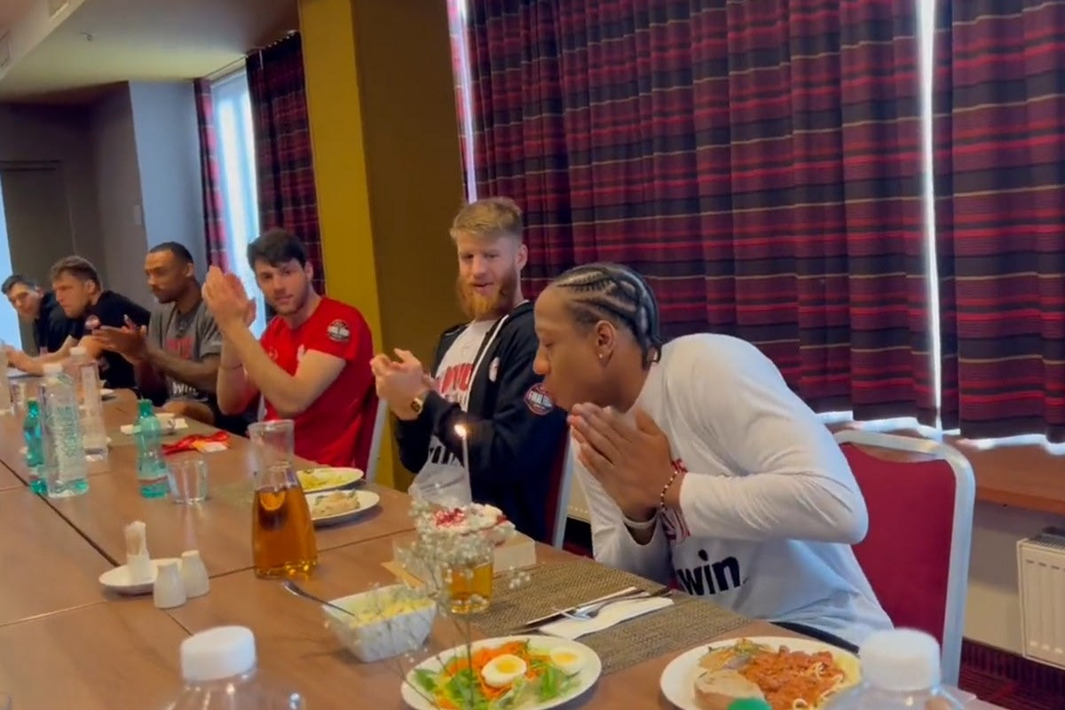 Με την ομάδα να τρώει το μεσημεριανό της λοιπόν, στον χώρο εμφανίστηκε μία τούρτα έκπληξη, με τους συμπαίκτες του Αμερικανού να του τραγουδούν το “Happy Birthday” και στην συνέχεια τον Κάναν να σβήνει το κερί μέσα σε χειροκροτήματα.