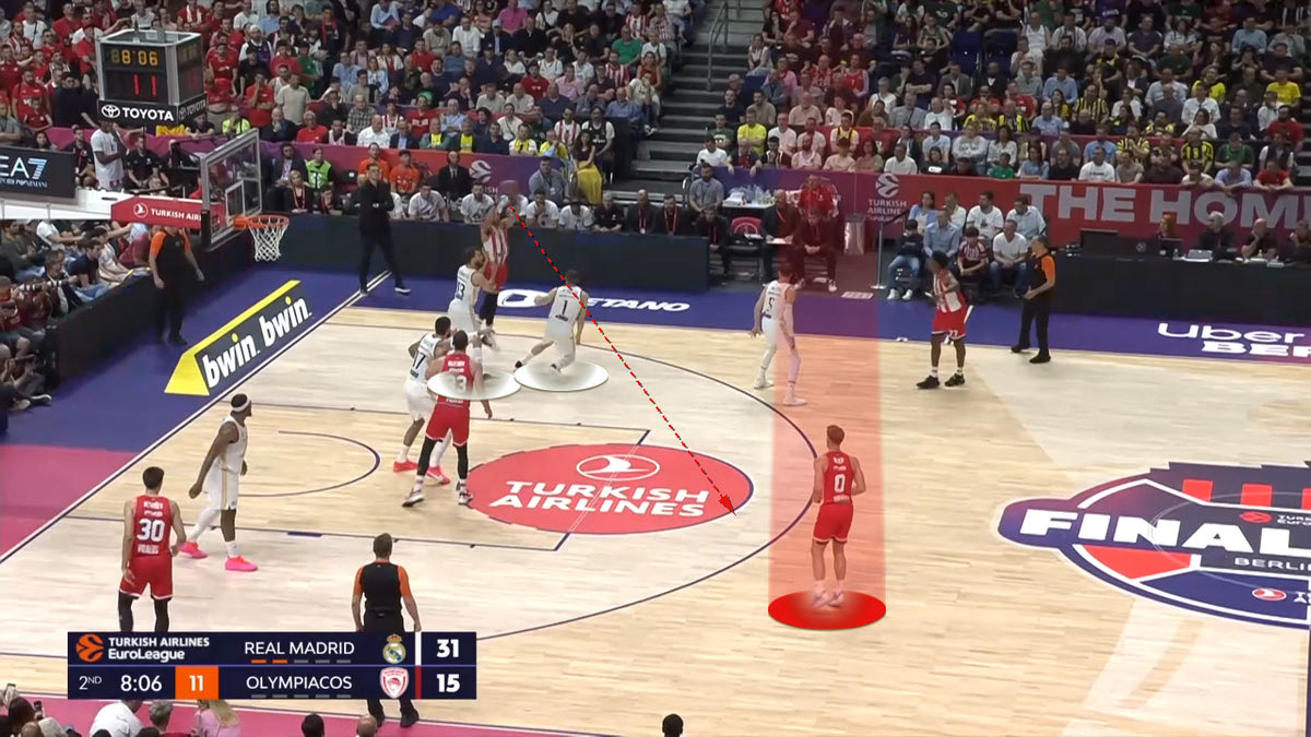 Η Ρεάλ είναι μία ομάδα που με την άμυνα που παίζει υποχρεώνει κάθε αντίπαλο να οδηγείται στο Pick and Roll, ρίχνοντάς τον πάνω στον Ταβάρες. Η πίεση στην μπάλα – αλλά και μακριά από αυτή – είναι ασφυκτική. Οι βοήθειες που δίνει είναι ελάχιστες στο Pick and Roll. Παράλληλα όμως, οι Μαδριλένοι κάνουν κάτι ακόμα: Αφήνουν προκλητικά ελεύθερους κάποιους παίκτες. Αυτό έκαναν και χθες (24/5), δίνοντας συνεχώς το σουτ σε παίκτες όπως ο Τόμας Γουόκαπ, ο Σακίλ ΜακΚίσικ, ο Φίλιπ Πετρούσεβ. Ιδού το πιο ξεκάθαρο παράδειγμα: