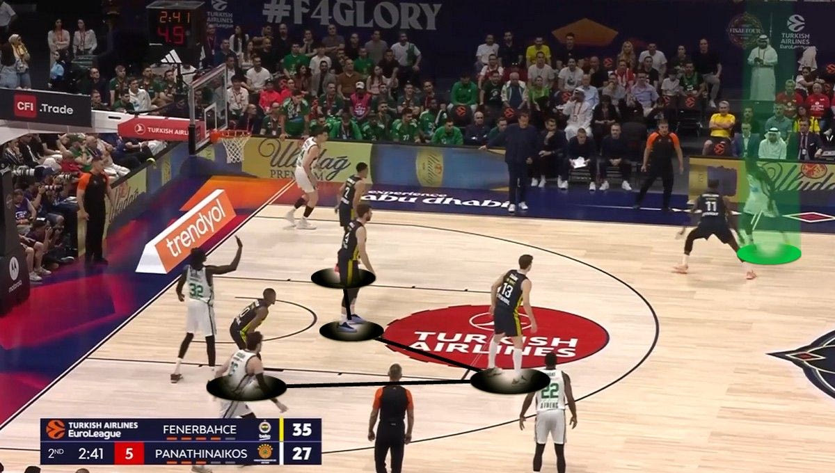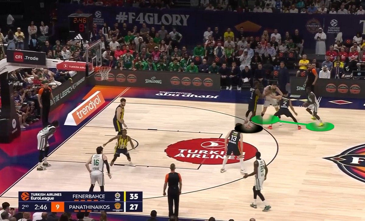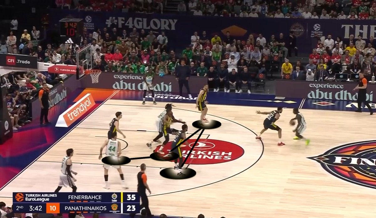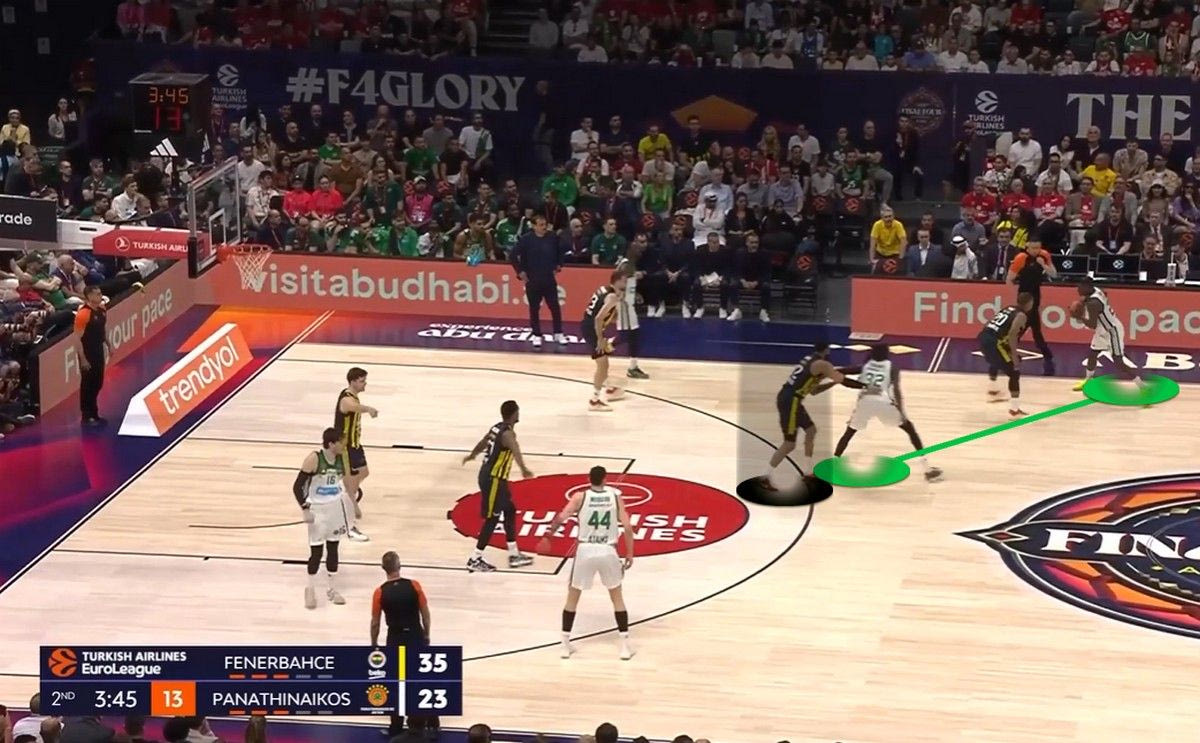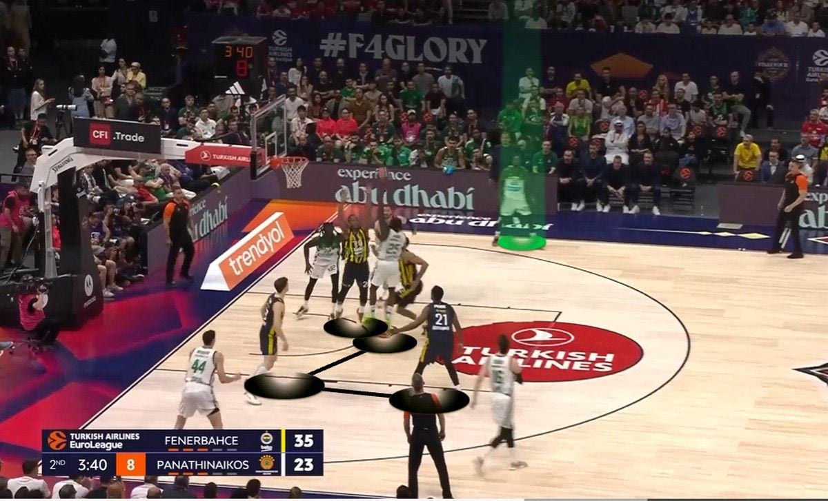 Ο τρόπος που καλύπτει χώρους η Φενέρ είναι μοναδικός. Η άμυνα με αλλαγές στο Pick and Roll βάζει την αντίπαλη ομάδα στην διαδικασία να επιτεθεί κυρίως με τον χειριστή. Ταυτόχρονα, όμως, όλη η Φενέρ αμύνεται ως ένα, δεν αφήνει ελεύθερα σουτ. Αυτό εγκλώβισε την επίθεση του Παναθηναϊκού AKTOR. Κάτι που οδηγεί στο αμέσως επόμενο πρόβλημα.