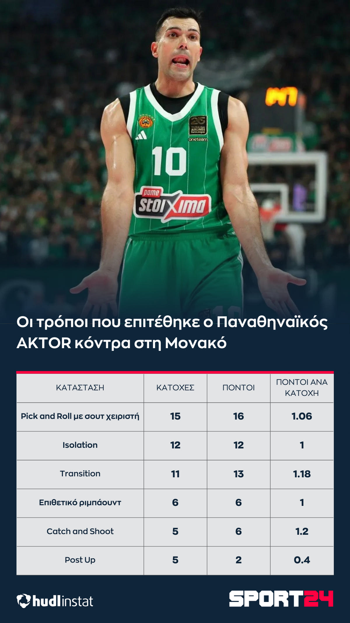 Για κακή τύχη του Παναθηναϊκού AKTOR, επιβεβαιώθηκε στο απόλυτο η υπεροχή της Φενέρ σε αυτό τον τομέα, που εν πολλοίς έκρινε το παιχνίδι. Σύμφωνα μ ετο Hudl Instat, η Φενέρ σημείωσε 22 πόντους σε κατάσταση Catch and Shoot σε 16 κατοχές, ενώ το “τριφύλλι” σημείωσε μόλις 6 πόντους σε 5 κατοχές (δύο τρίποντα του Όσμαν). Αυτοί οι 16 πόντοι διαφοράς σε τέτοια κατάσταση δεν μπορεί να καλυφθεί. Ο Παναθηναϊκός AKTOR βρίσκει φέτος 14 τρίποντα σε κατάσταση Catch and Shoot ανά αγώνα και κόντρα στην Φενέρ βρήκε μόλις 5.