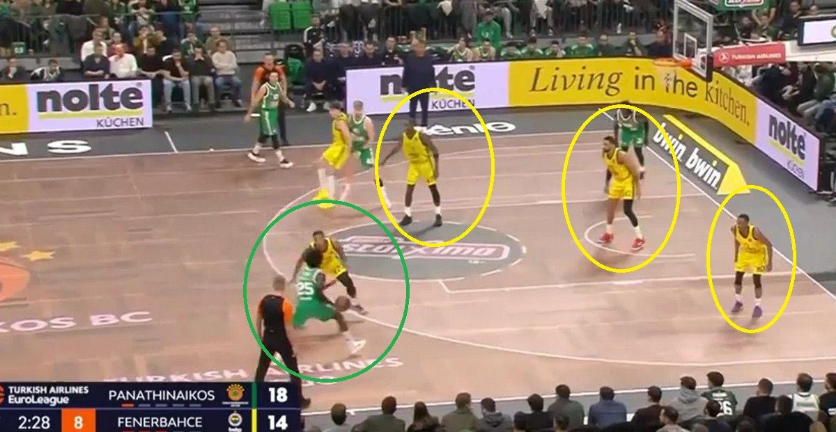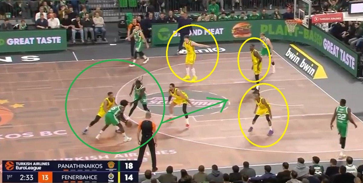 Την ίδια στιγμή, ωστόσο – όπως ήδη αναφέρθηκε – η Φενέρ έχει την καλύτερη άμυνα στην EuroLeague σε κατάσταση Catch and Shoot, δεχόμενη τους λιγότερους πόντους. Στον αντίποδα, ο Παναθηναϊκός AKTOR έχει την 4η χειρότερη επίδοση στην EuroLeague, δεχόμενος 15 πόντους ανά αγώνα σε τέτοια κατάσταση. Αυτό έχει εξήγηση βέβαια: Οι “πράσινοι” παίζουν συχνά Hedge Out στο Pick and Roll (ο ψηλός βγαίνει δυναμικά στον χειριστή), αυτό έχει ως αποτέλεσμα να έρχεται βοήθεια από τρίτο παίκτη (από τις 45 μοίρες ή την γωνία της αδύνατης πλευράς). Οι καλές επιθέσεις το διαβάζουν αυτό και βρίσκουν ελεύθερα σουτ.