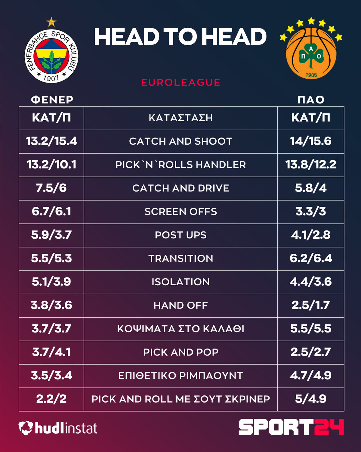 Μία ακόμα σημείωση: Σύμφωνα με το Hudl Instat, ο Παναθηναϊκός AKTOR είναι η ομάδα που δέχεται τους περισσότερους πόντους από κάθε άλλη στην EuroLeague σε κατάσταση Pick and Roll όπου την προσπάθεια παίρνει ο ψηλός. Η Φενέρ όμως είναι η ομάδα που σημειώνει τους λιγότερους πόντους από κάθε άλλη ομάδα σε τέτοια κατάσταση στην διοργάνωση. Λαμβάνοντας υπόψη ότι αυτή είναι δεδομένη αδυναμία της “πράσινης” άμυνας, θα έχει σίγουρα ενδιαφέρον αν η Φενέρ θα αλλάξει λίγο την στόχευσή της και τροφοδοτήσει περισσότερο τους ψηλούς της.