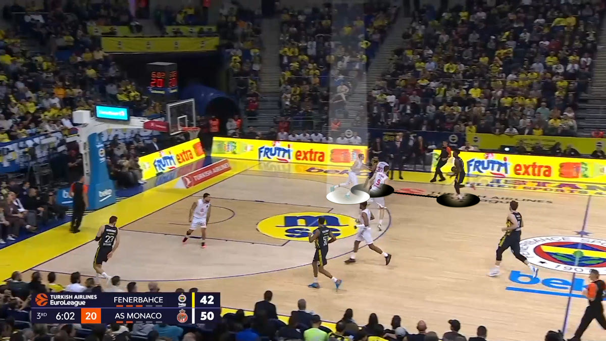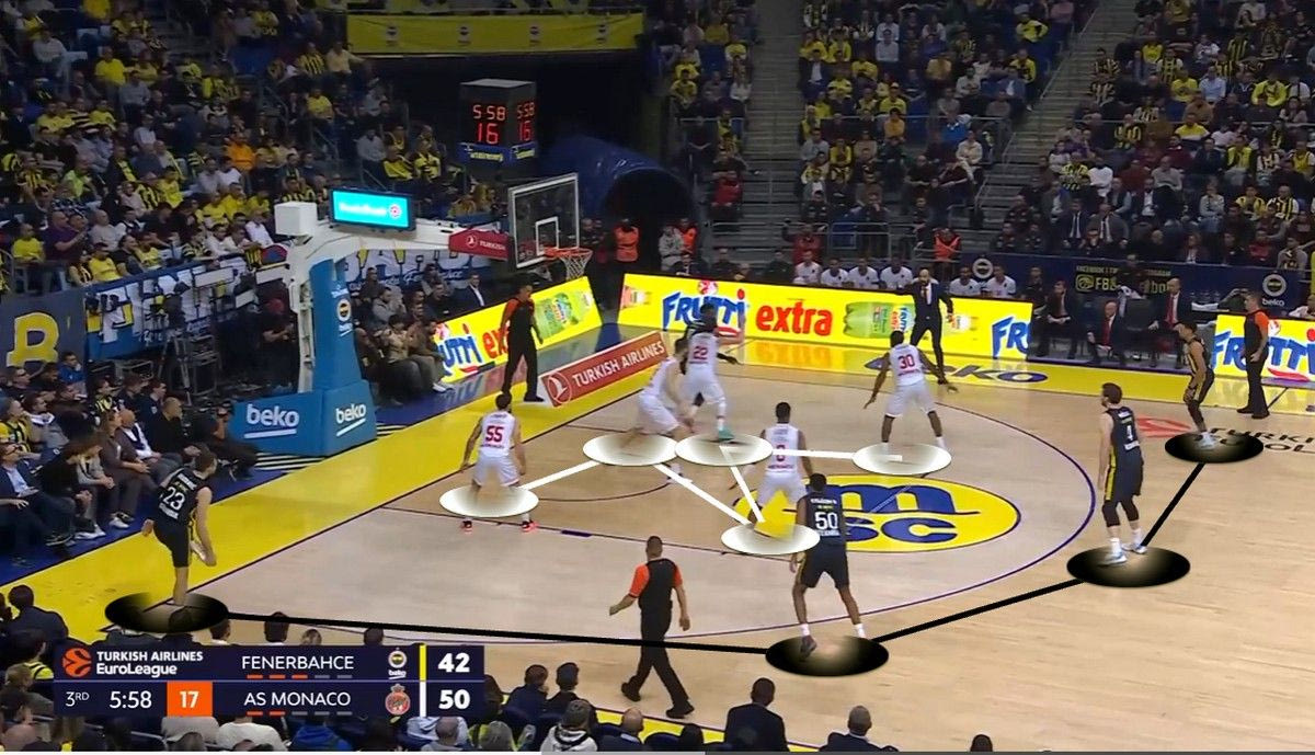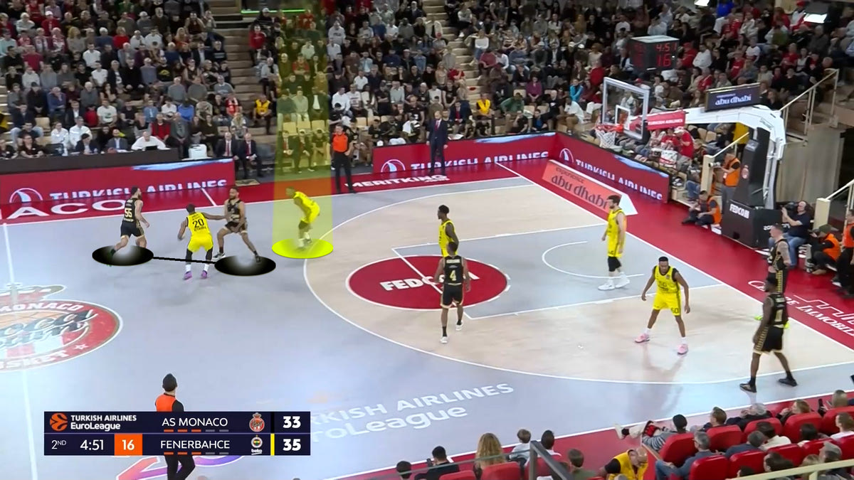 Τι σημαίνει αυτό; Αρχικά ότι ένα δυνατό κομμάτι της άμυνας της Μονακό (η άμυνα στο τρίποντο) πέφτει πάνω στο δυνατό κομμάτι της Φενέρ (δημιουργία ελεύθερων σουτ). Κοινώς, τίθεται το θέμα ποια ομάδα θα κερδίσει αυτή τη μάχη: Η άμυνα της Μονακό ή η επίθεση της Φενέρ; Η απάντηση σε αυτό θα κρίνει πολλά, αφού αν οι Τούρκοι βρουν σουτ, είναι άλλη ομάδα.