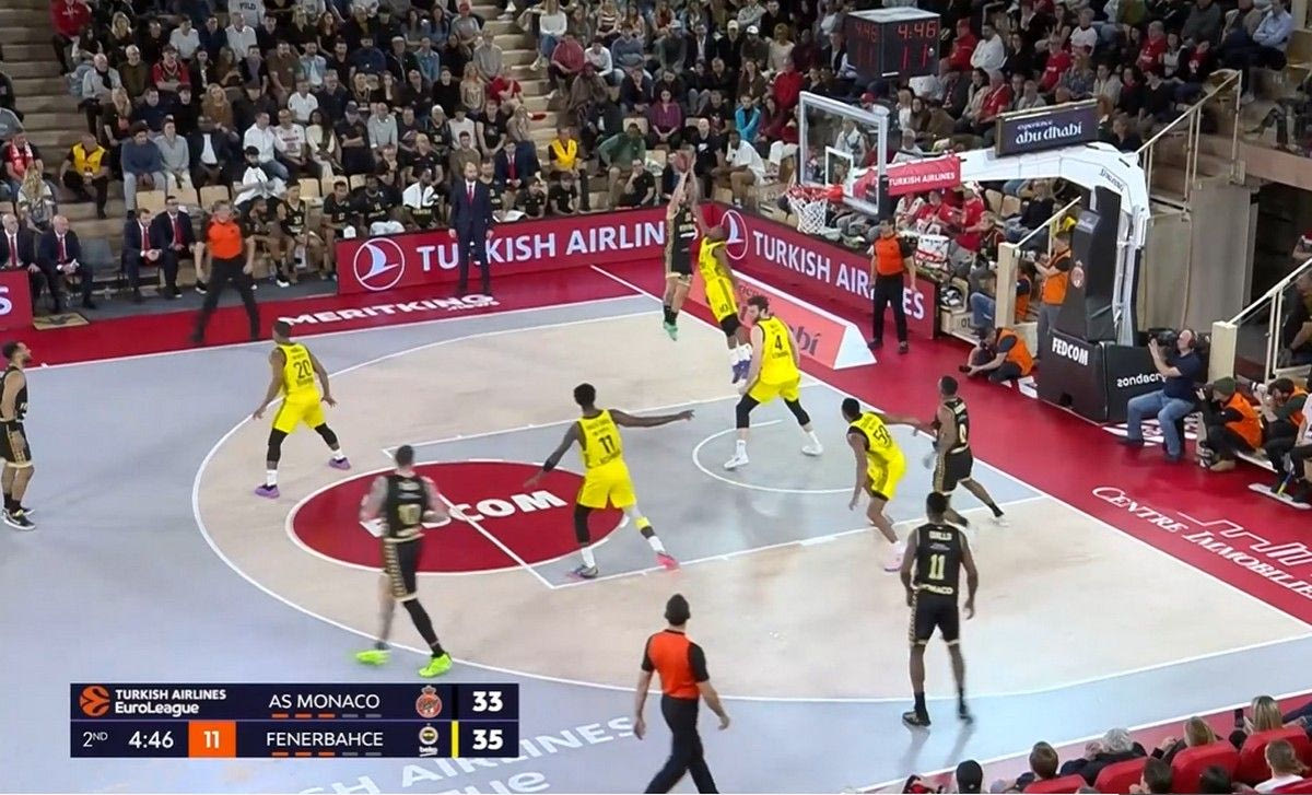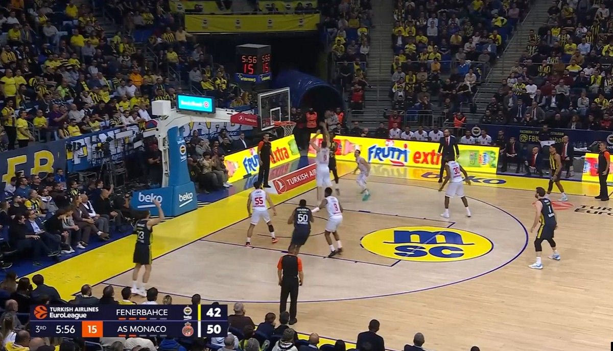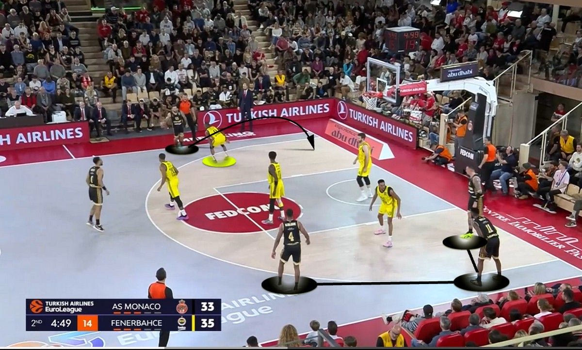 Ο περιορισμός της δράσης των Τζέιμς και Οκόμπο είναι κομβικός για την Φενέρ. Η άμυνα με αλλαγές έδωσε λύσεις κόντρα στον Παναθηναϊκό AKTOR, αλλά η Μονακό είναι διαφορετική ομάδα. Δεν στοχεύει απαραίτητα τον αντίπαλο σέντερ. Συχνά δίνει σκριν στον Τζέιμς ή στον Οκόμπο με γκαρντ, για να σημαδέψει έναν αδύναμο – αμυντικά – περιφερειακό. Ιδού ένα παράδειγμα από το ματς του δεύτερου γύρου.