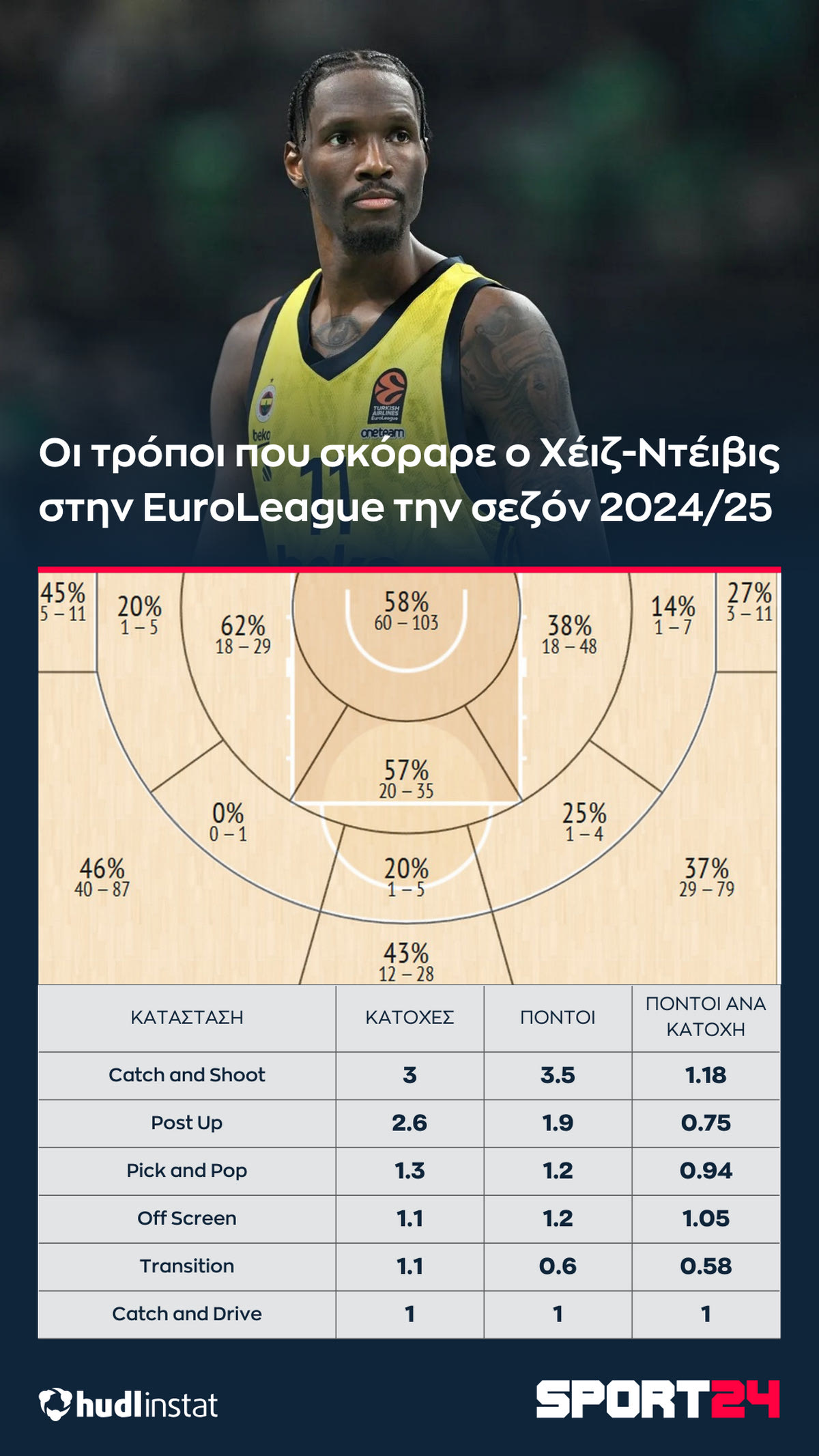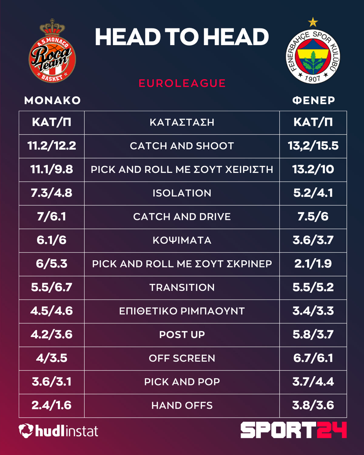 Η Φενέρ, όμως, έχει την ίδια στιγμή την 7η χειρότερη επίδοση στην EuroLeague σε αμυντική κατάσταση Catch and Drive, αφού το τίμημα του να κλείνει τα τρίποντα είναι να δέχεται πολλά drive. Κοινώς, είναι ευάλωτη σε αυτό τον τομέα, ενώ αυτό είναι ένα δυνατό σημείο της Μονακό.