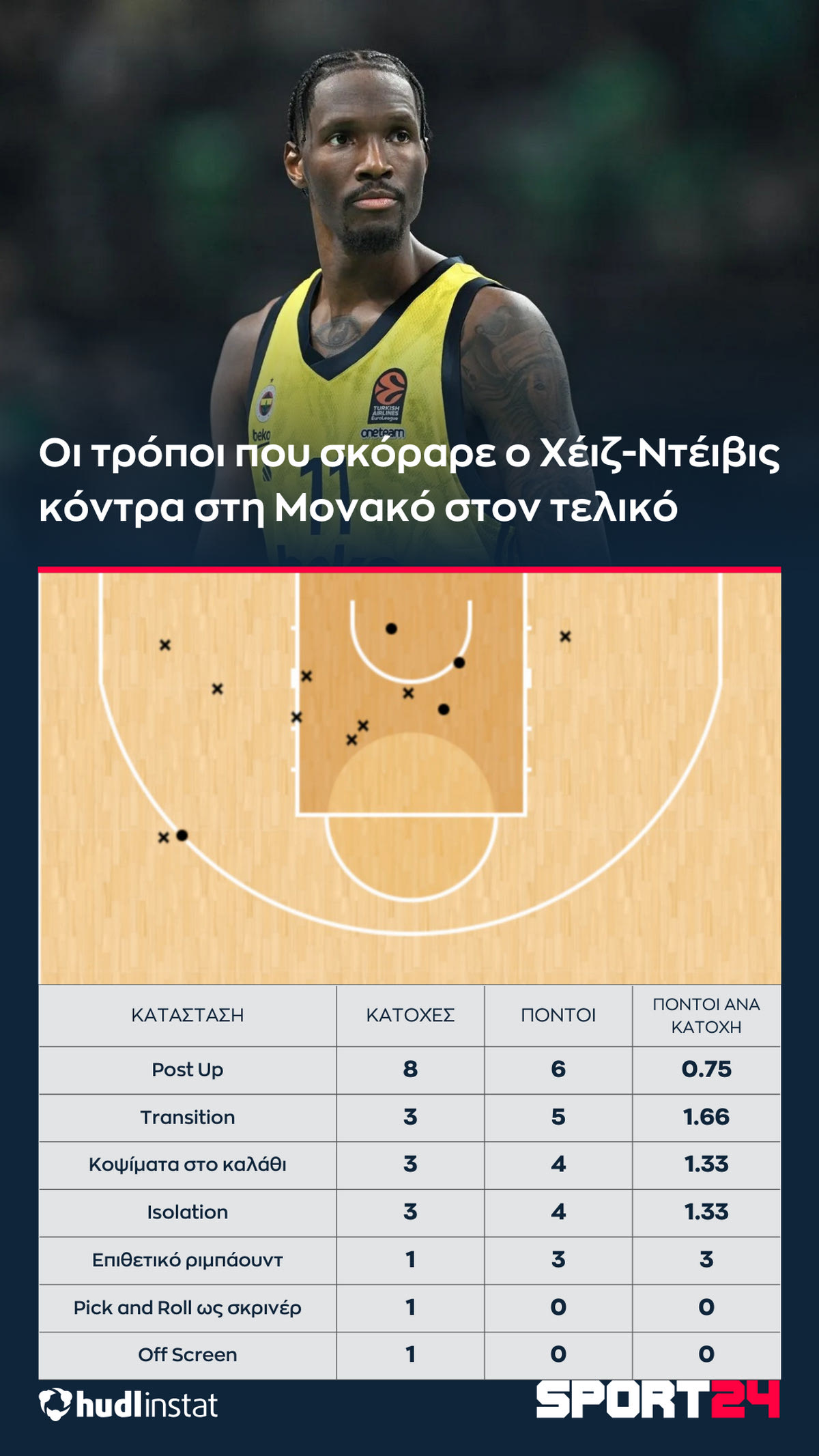 Ο Στέφανος Μακρής αναλύει με την βοήθεια του Hudl Instat τη νίκη της Φενέρμπαχτσε επί της Μονακό στον τελικό της EuroLeague. Ο Χέιζ-Ντέιβις που έδωσε πράγματα σε ένα κακό βράδυ, τα σουτ του Γκούντουριτς και ο περιορισμός των Τζέιμς, Οκόμπο.