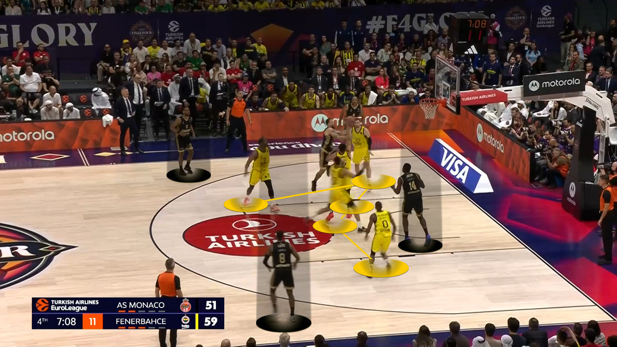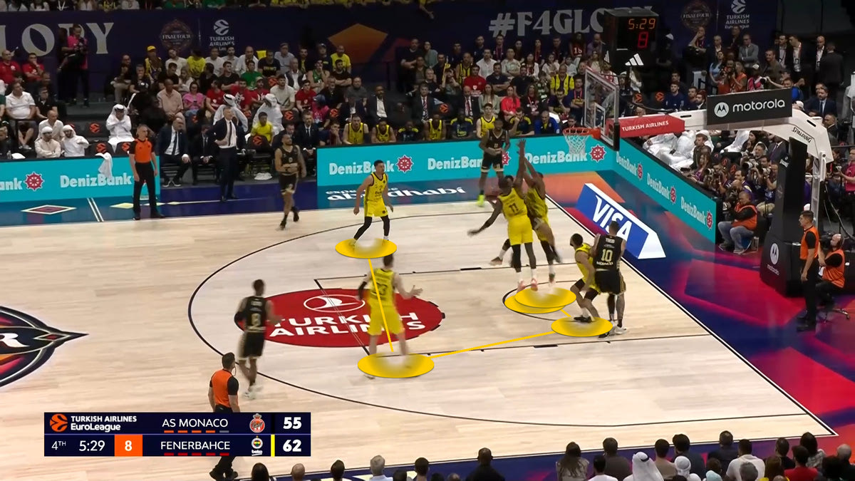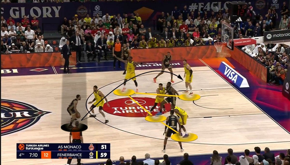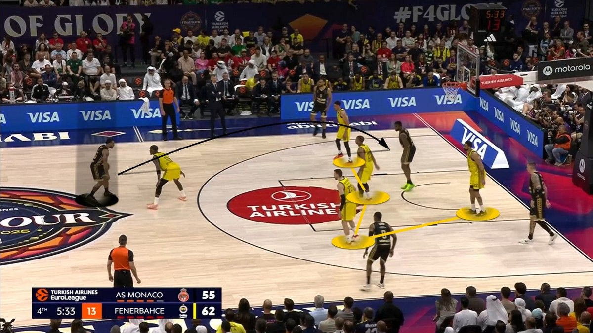 *Με κυκλάκι τα εύστοχα σουτ, με “x” τα άστοχαΗ Φενέρ επέλεξε να αλλάζει συνεχώς στο Pick and Roll τον Τζέιμς, οδηγώντας τον σε προσωπικές ενέργειες. Με την Μονακό να έχει μέτριους σουτέρ τριών πόντων σε κατάσταση Catch and Shoot (αλλά εξαιρετικούς σε Catch and Drive), ο στόχος ήταν να στηθεί ένα τείχος απέναντι σε Τζέιμς και Οκόμπο, ώστε να οδηγηθούν σε ατομικές ενέργειες. Και αυτό έγινε. Ιδού ένα παράδειγμα: