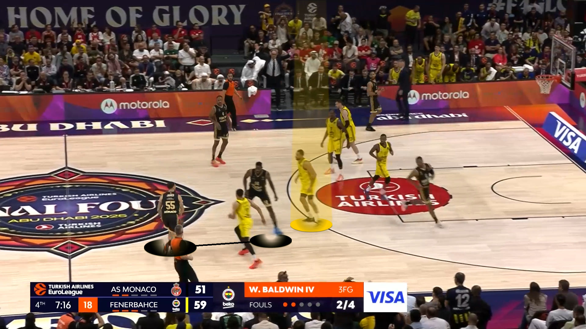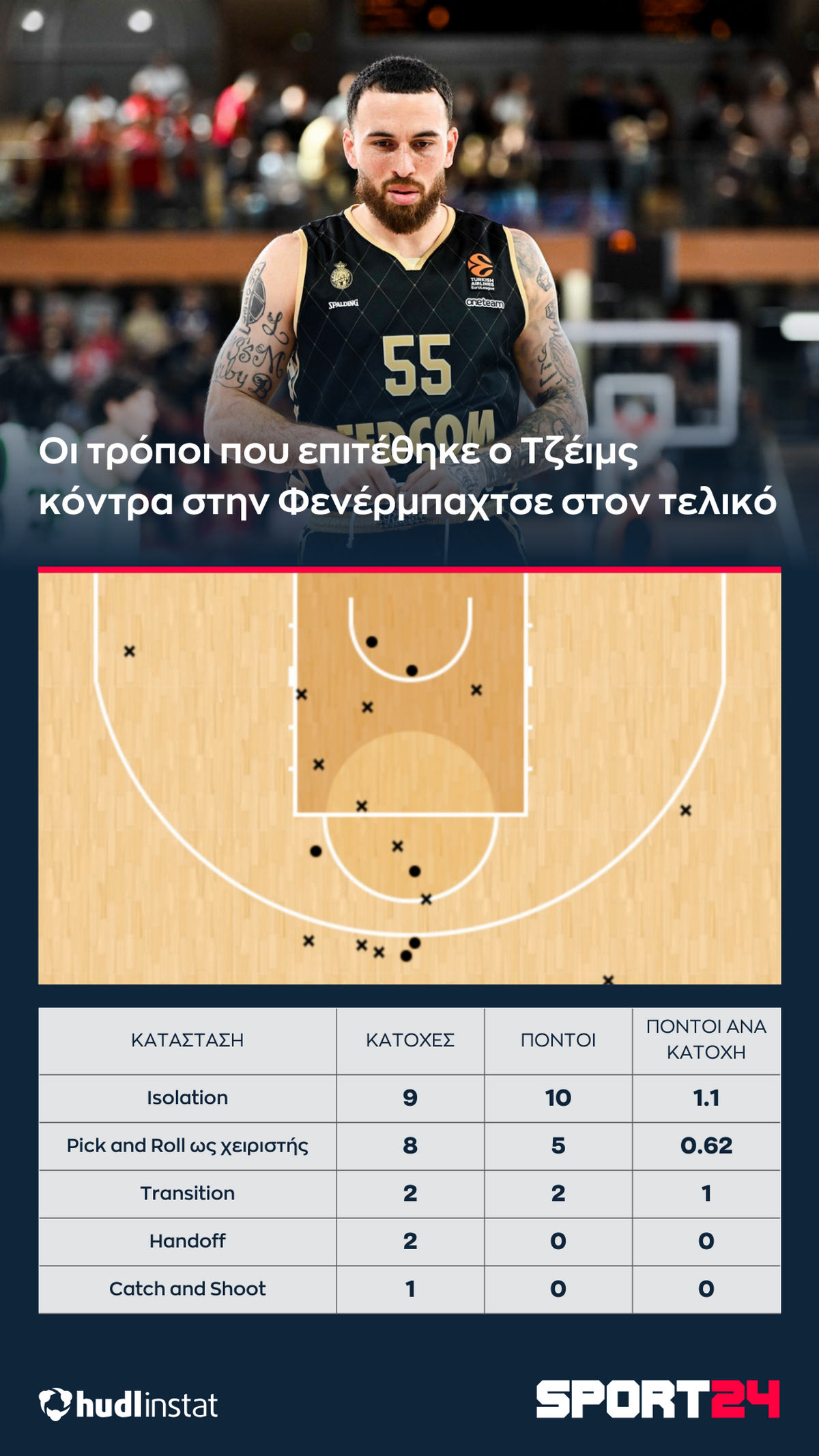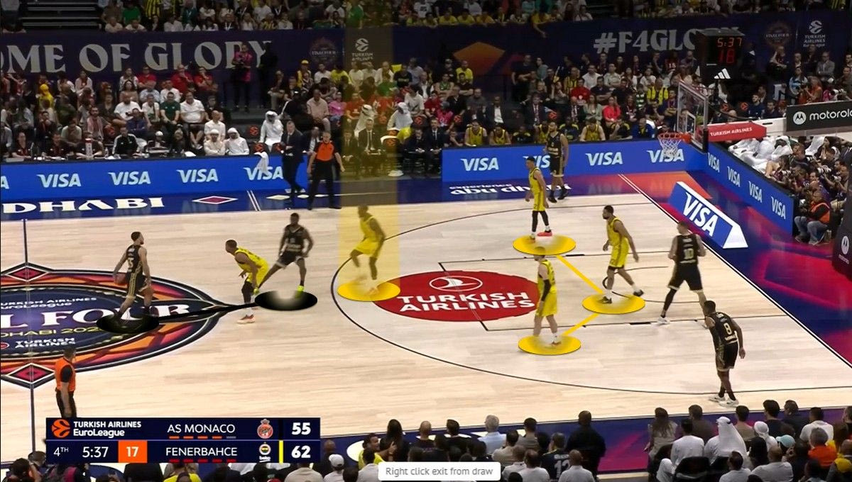 *Με κυκλάκι τα εύστοχα σουτ, με “x” τα άστοχαΗ Φενέρ επέλεξε να αλλάζει συνεχώς στο Pick and Roll τον Τζέιμς, οδηγώντας τον σε προσωπικές ενέργειες. Με την Μονακό να έχει μέτριους σουτέρ τριών πόντων σε κατάσταση Catch and Shoot (αλλά εξαιρετικούς σε Catch and Drive), ο στόχος ήταν να στηθεί ένα τείχος απέναντι σε Τζέιμς και Οκόμπο, ώστε να οδηγηθούν σε ατομικές ενέργειες. Και αυτό έγινε. Ιδού ένα παράδειγμα: