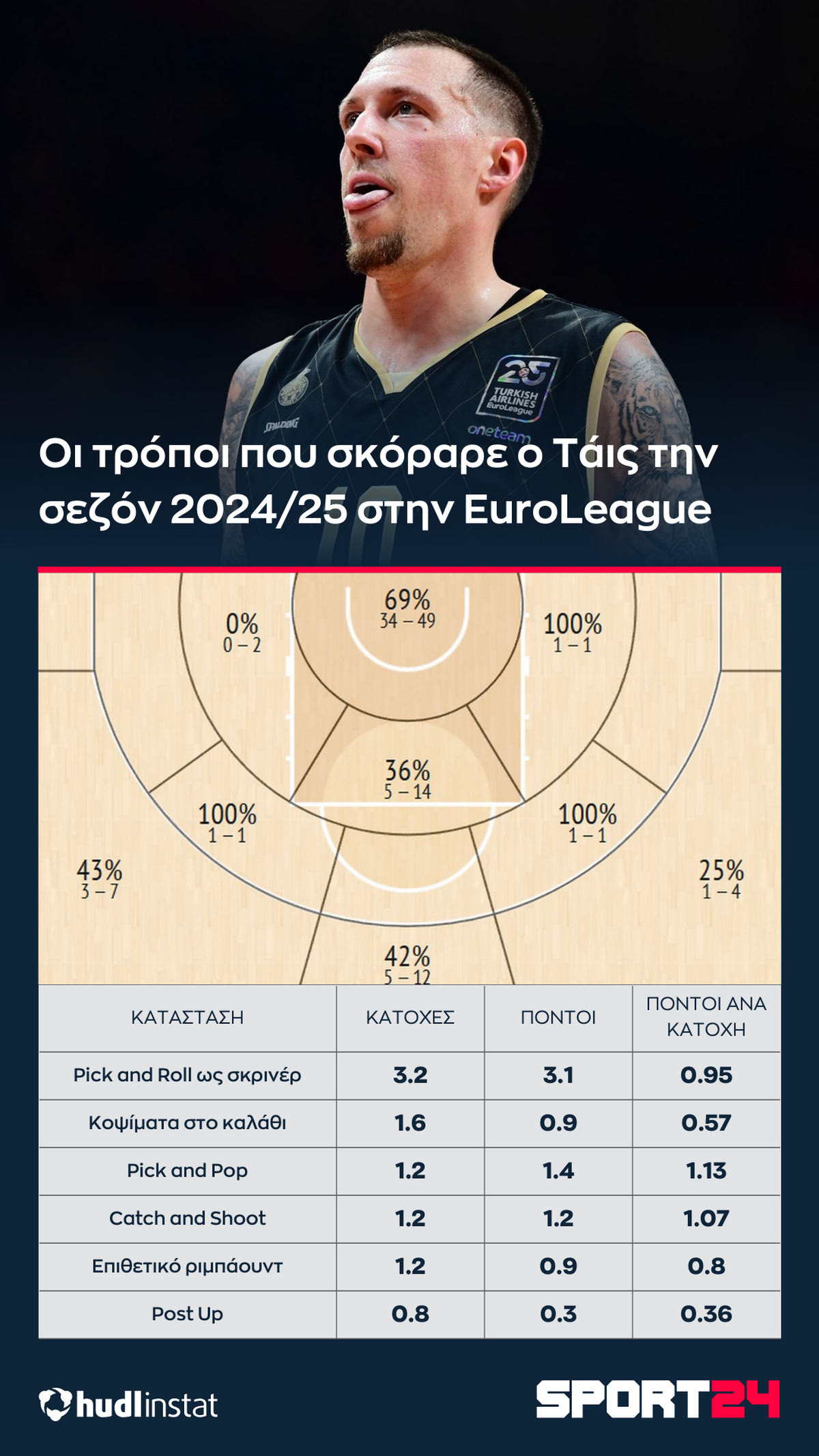 Ο άλλοτε NBAερ ψηλός αποτελεί εξίσου μεγάλη απειλή τόσο σε κατάσταση Pick and Roll, όσο και Pick and Pop, ενώ με το μάκρος του και το μπασκετικό του I.Q έχει δέσει ακόμα περισσότερο την άμυνα του συνόλου του Βασίλη Σπανούλη.