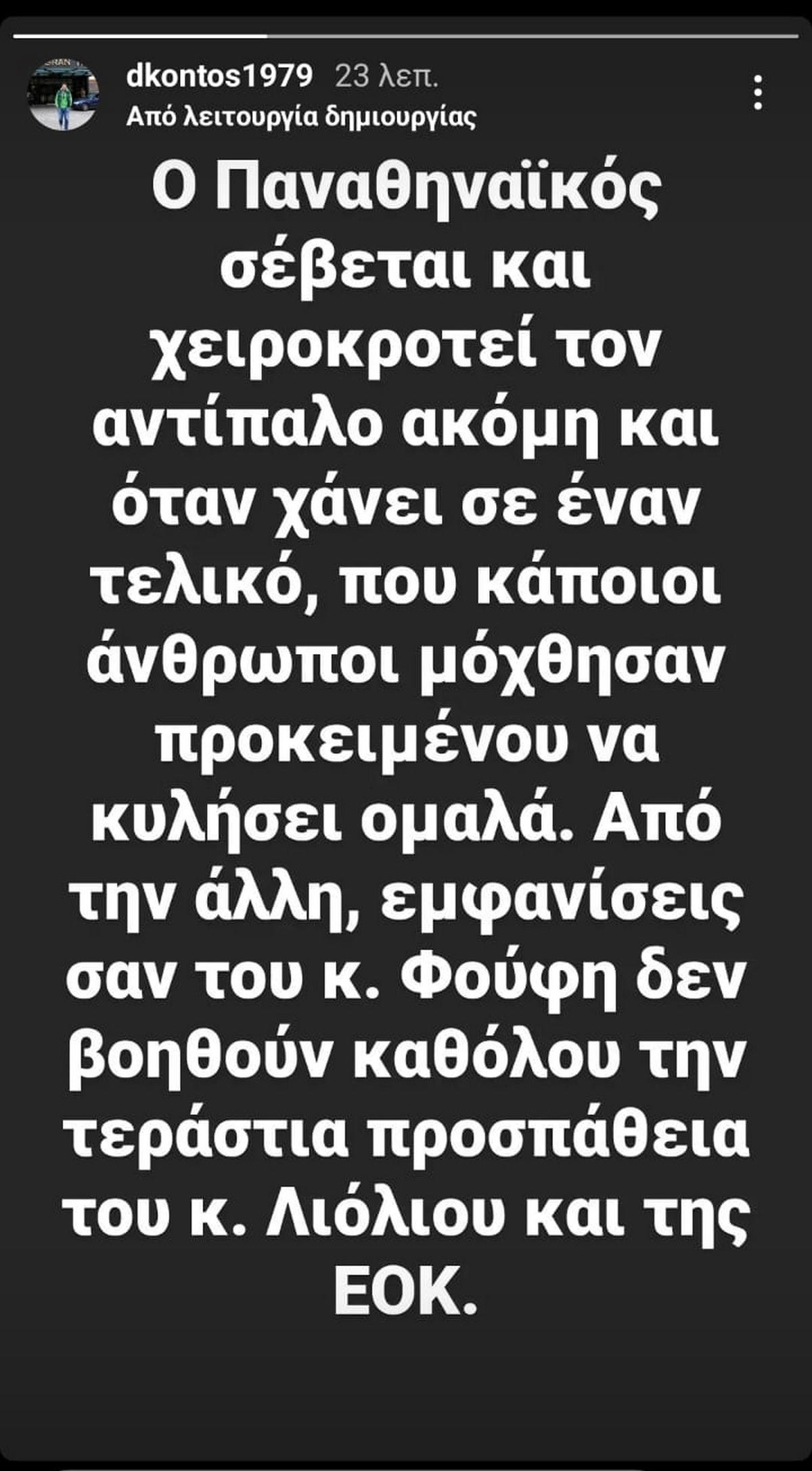 Όπως χαρακτηριστικά ανέφερε, “Ο Παναθηναϊκός σέβεται και χειροκροτεί τον αντίπαλο ακόμη και όταν χάνει σε έναν τελικό, που κάποιοι άνθρωποι μόχθησαν προκειμένου να κυλήσει ομαλά. Από την άλλη, εμφανίσεις σαν του κ. Φούφη δεν βοηθούν καθόλου την τεράστια προσπάθεια του κ. Λιόλιου και της ΕΟΚ”.