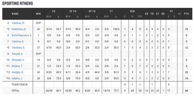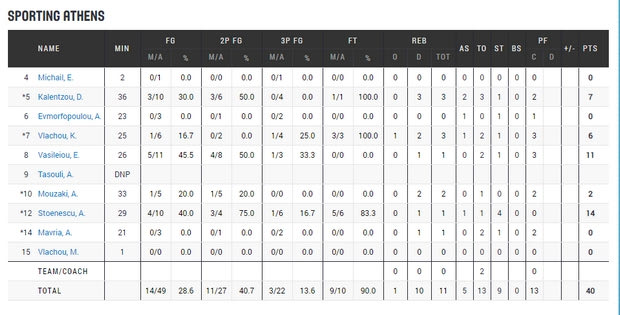 Οι πόντοι του Σπόρτινγκ από εκείνο το παιχνίδι: Μιχαήλ, Καλέντζου 7, Ευμορφοπούλου, Βλάχου Α. 6 (1), Βασιλείου 11 (1), Μουζάκη 2, Στοενέσκου 14 (1), Μαυριά, Βλάχου Μ.