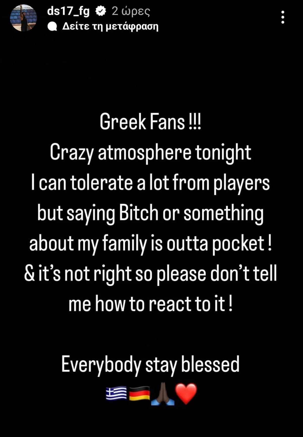 Ο NBAερ γκαρντ ανέβασε ένα story στον επίσημο λογαριασμό του στο Instagram, γράφοντας: “Έλληνες φίλαθλοι!!! Σπουδαία ατμόσφαιρα σήμερα. Μπορώ να αντέξω πολλά από παίκτες, αλλά το να με αποκαλούν σκ…α ή να λένε κάτι για την οικογένειά μου ξεπερνάει τα όρια και δεν είναι σωστό, οπότε σας παρακαλώ μην μου λέτε πώς να αντιδρώ σε αυτό. Να είστε ευλογημένοι”.