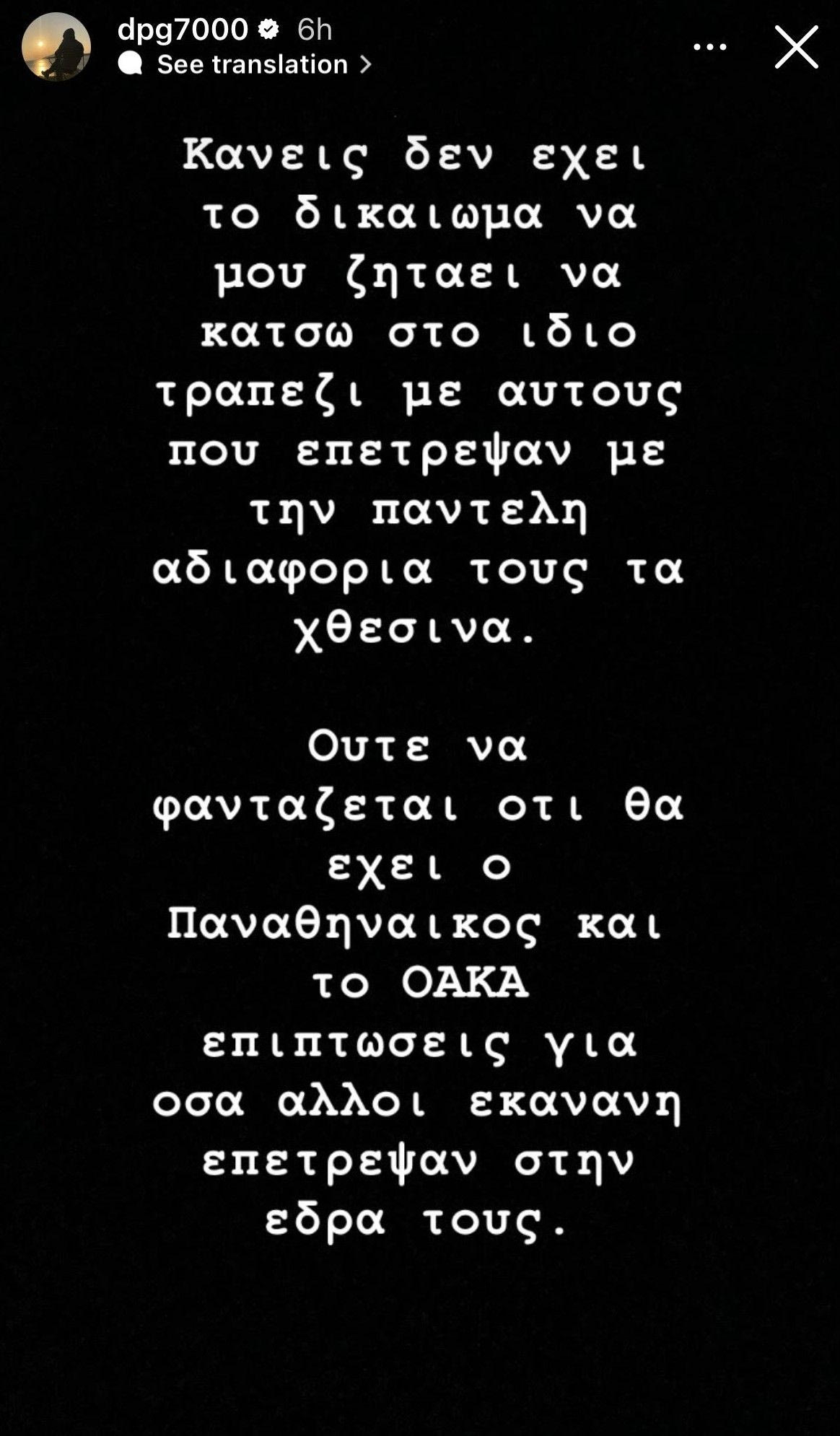 Ο Δημήτρης Γιαννακόπουλος ανήρτησε story περίπου δύο ώρες μετά τα μεσάνυχτα της Δευτέρας (2/6) και ανέφερε ότι κανείς δεν έχει το δικαίωμα να τού ζητάει να κάτσει στο ίδιο τραπέζι με αυτούς που επέτρεψαν με την παντελή αδιαφορία τους όσα συνέβησαν μετά τον δεύτερο τελικό του πρωταθλήματος στο Στάδιο Ειρήνης και Φιλίας.