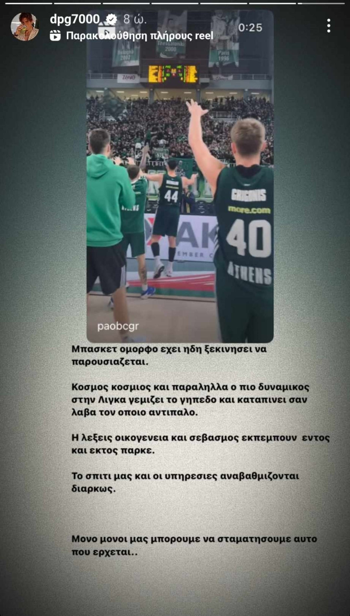 “Μπάσκετ όμορφο έχει ήδη ξεκινήσει να παρουσιάζεται. Κόσμος κόσμιος και παράλληλα ο πιο δυναμικός στην Λίγκα γεμίζει το γήπεδο και καταπίνει σαν λάβα τον όποιο αντίπαλο. Οι λέξεις οικογένεια και σεβασμός εκπέμπουν εντός και εκτός παρκέ. Το σπίτι μας και οι υπηρεσίες αναβαθμίζονται διαρκώς. Μόνο μόνοι μας μπορούμε να σταματήσουμε αυτό που έρχεται…”