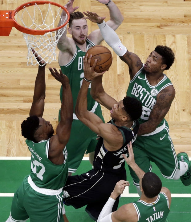 Στην συγκεκριμένη φωτογραφία οι παίκτες που προσπαθούν να σταματήσουν τον Γιάννη είναι οι Σέμι Οτζελέγιε, Γκόρντον Χέιγουορντ, Μάρκους Σμαρτ και Τζέισον Τέιτουμ και δείχνει εν ολίγοις ότι οι “Κέλτες” πράγματι δοκίμασαν τα πάντα για να περιορίσουν τον “Greek Freak”! Έστω και χωρίς αποτέλεσμα όπως αποδεικνύουν οι 30 πόντοι, 8 ριμπάουντ και 5 ασίστ που έγραψε το “κοντέρ” του Γιάννη!