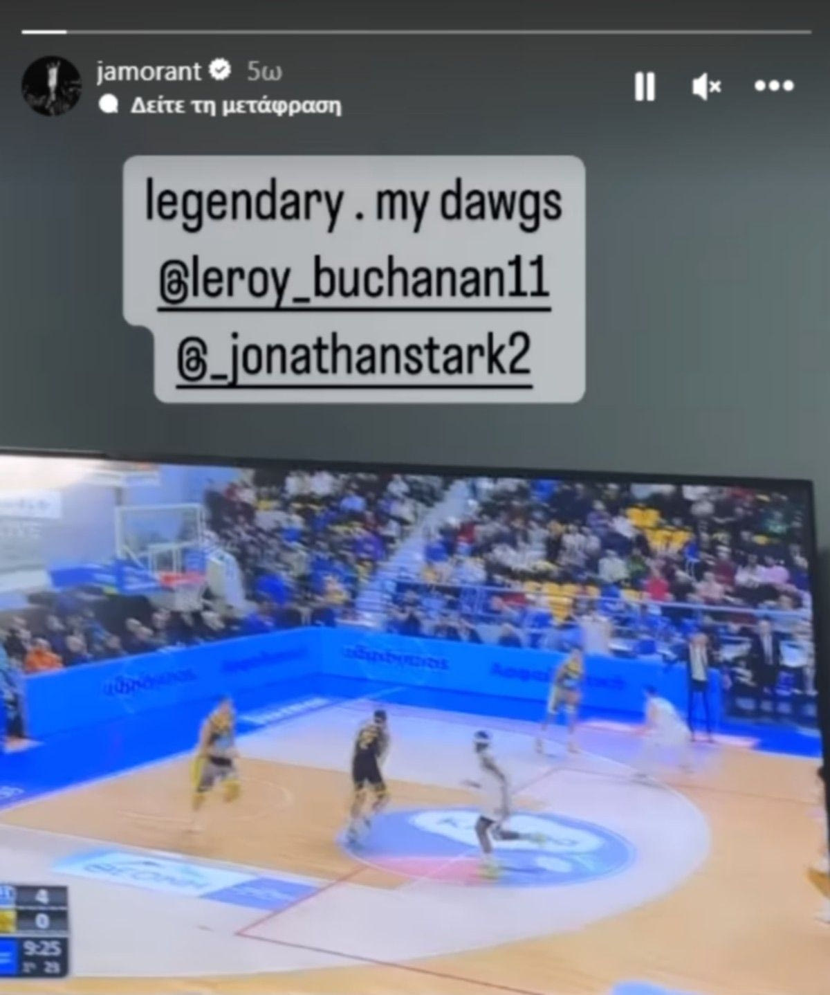 Ένα story με το Καρδίτσα - Άρης ανέβασε στο Instagram ο Τζα Μοράντ, για να υποστηρίξει δύο καλούς του φίλους, δύο πρώην συμπαίκτες του στο NCAA και το NBA.