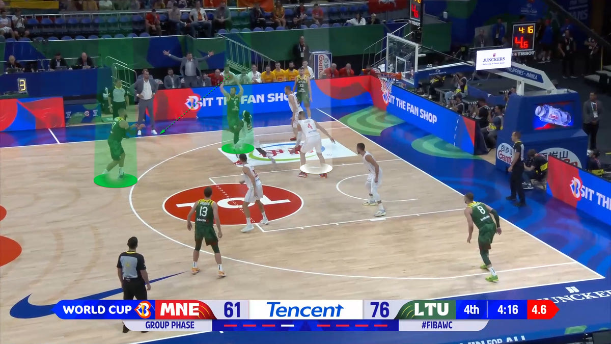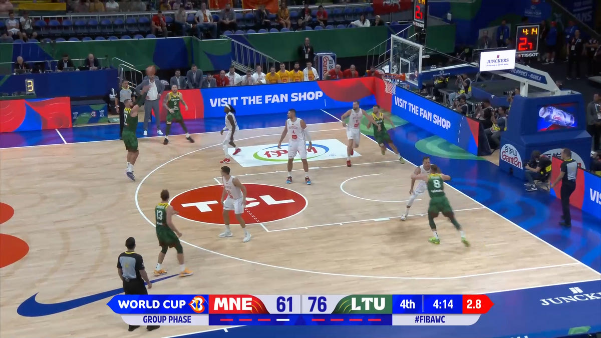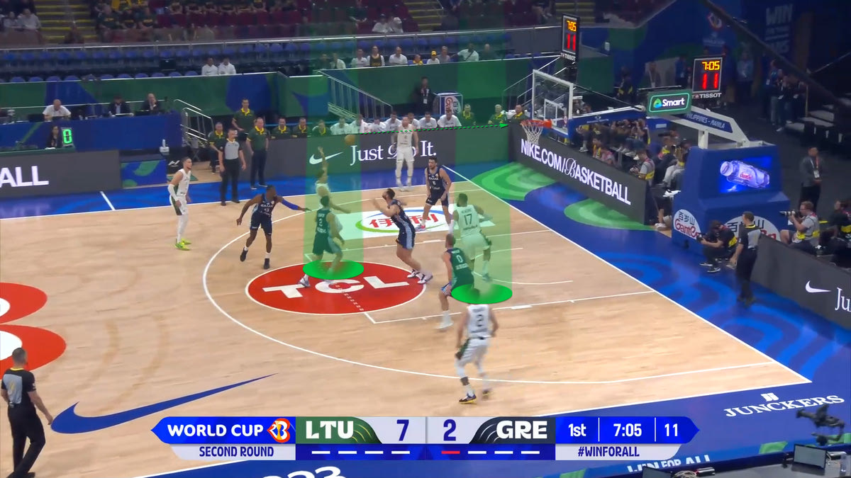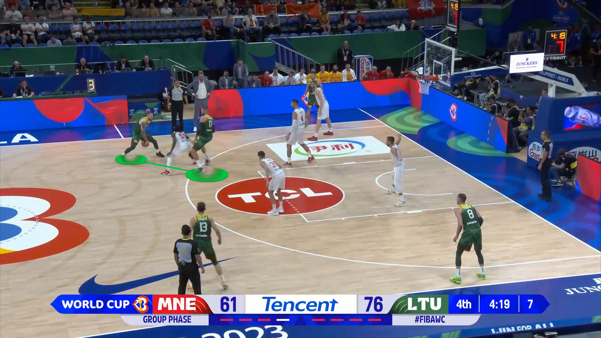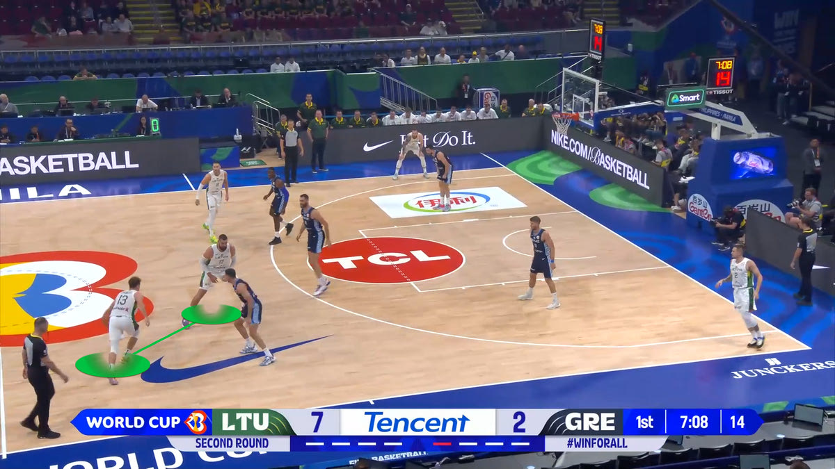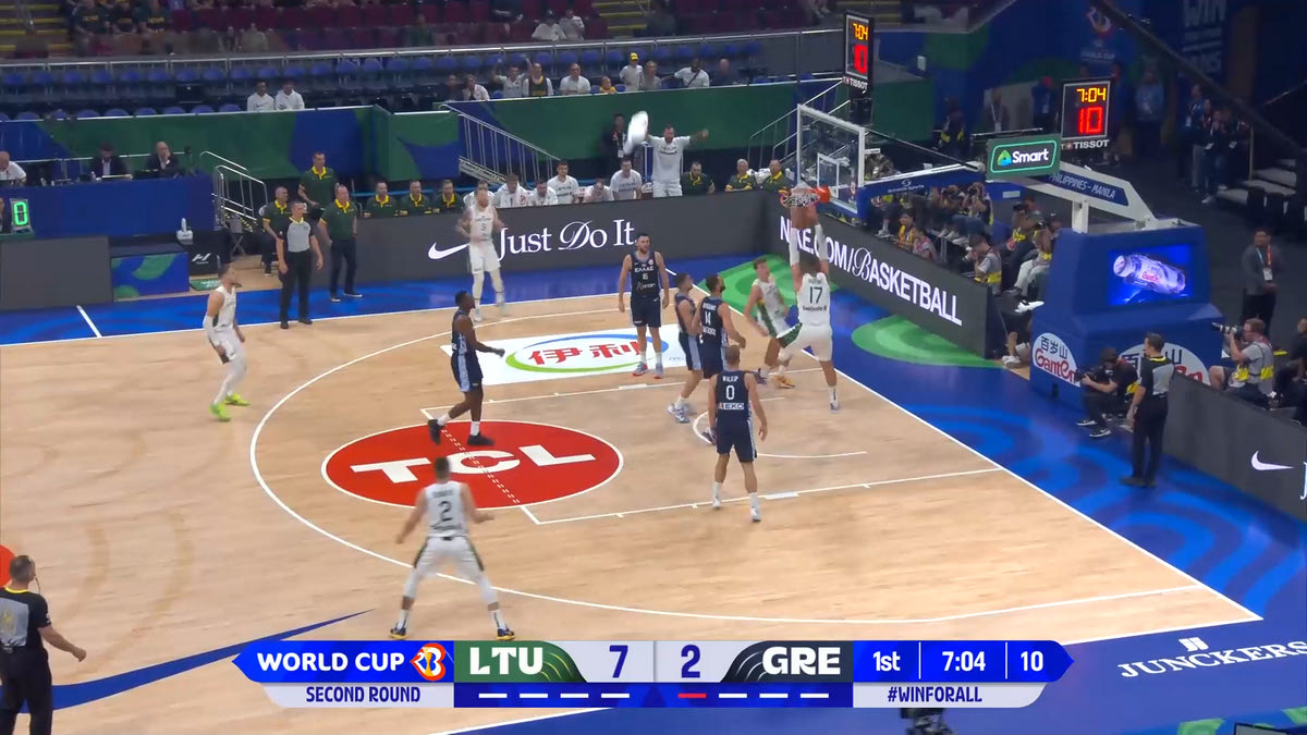 Ο Βαλαντιούνας ρολάρει και με την άμυνα της Ελλάδας να κλείνει πάνω στον Γιοκουμπάιτις, ο γκαρντ των Λιθουανών σηκώνει την μπάλα.