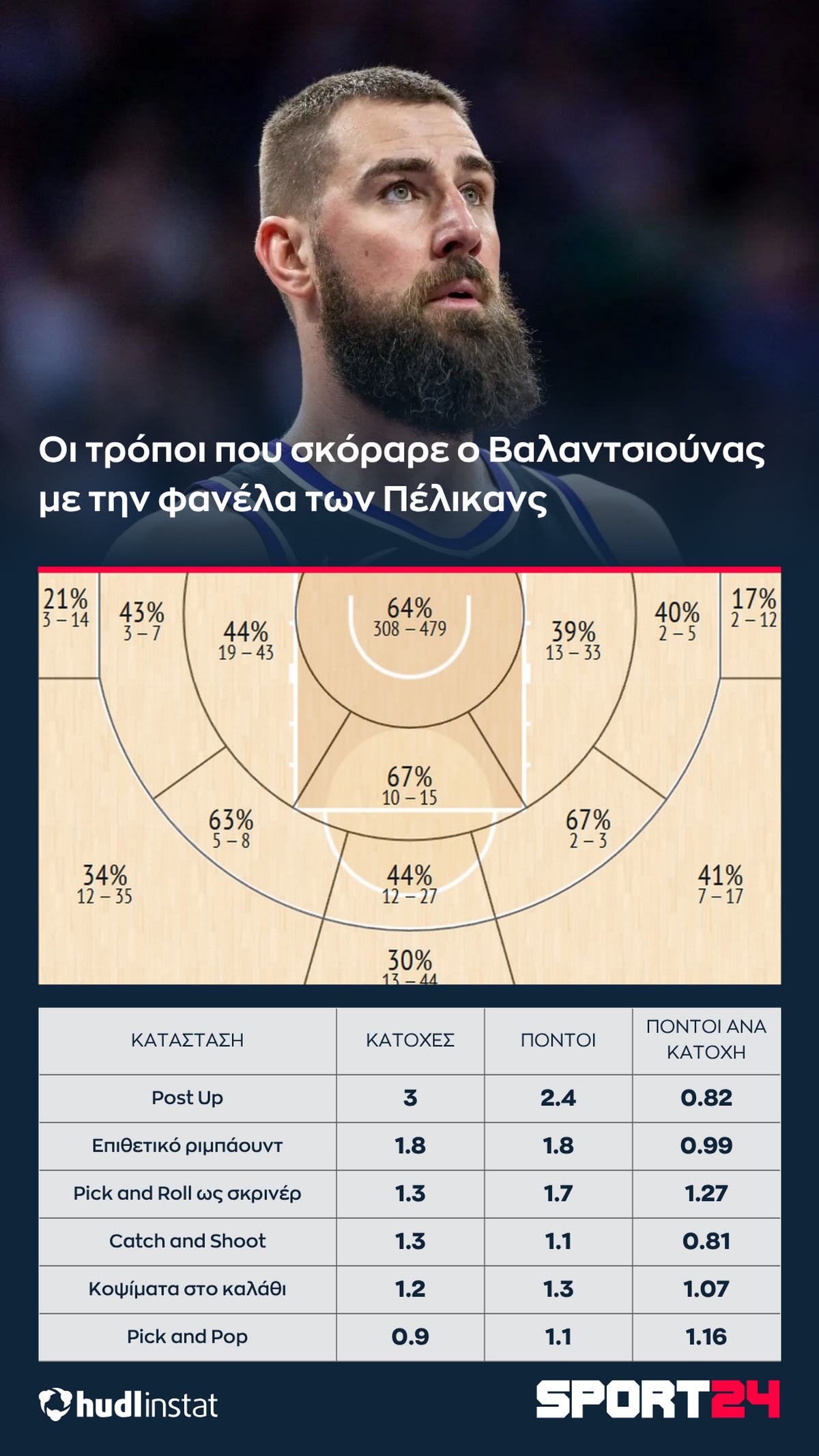 Ο Βαλαντσιούνας εξελίχθηκε αυτά τα χρόνια. Πήγε στο NBA ως ένας ψηλός που έπαιζε κυρίως με πλάτη στο καλάθι και ήταν σκρινέρ σε κατάσταση Pick and Roll. Εξελίχθηκε σε έναν παίκτη που μπορούσε να παίξει με πρόσωπο και πλάτη στο καλάθι, έναν ελίτ παίκτη σε κατάσταση Pick and Roll και παράλληλα μία απειλή από την περιφέρεια (από την σεζόν 2021/22 κι έπειτα, όταν άρχισε να σουτάρει περισσότερα τρίποντα). Λαμβάνοντας υπόψη την τελευταία σεζόν του που είχε ξεκάθαρο ρόλο στο NBA (την σεζόν 2023/24 στους Πέλικανς, όπου έπαιξε σε 82 αγώνες – όλους ως βασικός και είχε 12.2 πόντους, 8.8 ριμπάουντ και 2.1 ασίστ μέσο όρο με 30.8% στα τρίποντα σε 24 λεπτά συμμετοχής, αφού πέρυσι ήταν η κατάσταση ήταν περίεργη σε Γουίζαρντς και Κινγκς), ιδού πώς έκανε την περισσότερη ζημιά.