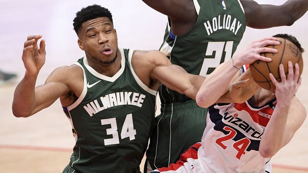 Οι Μπακς απώλεσαν προβάδισμα 26 πόντων, οι Γουίζαρντς μείωσαν στους πέντε, όμως ο Αντετοκούνμπο έβαλε οκτώ σερί και με διπλό ρεκόρ χάρη στο 25ο triple-double της καριέρας του "καθάρισε" ξανά στην Ουάσινγκτον (133-122) για το Μιλγουόκι.