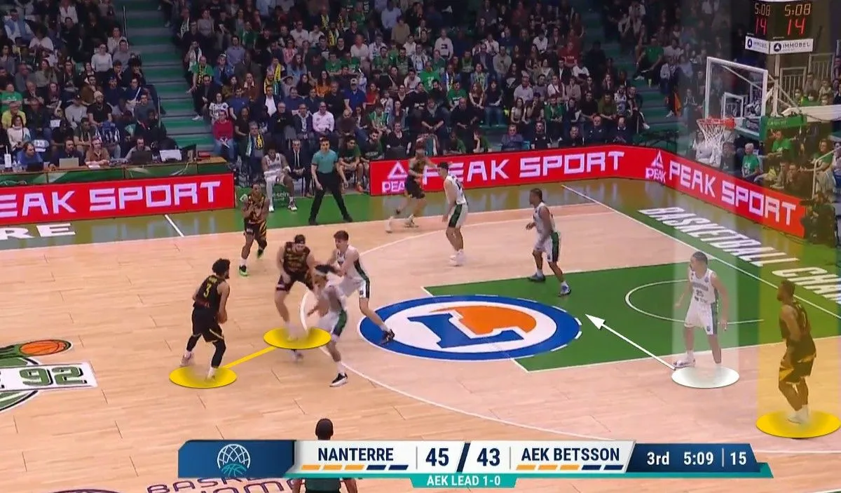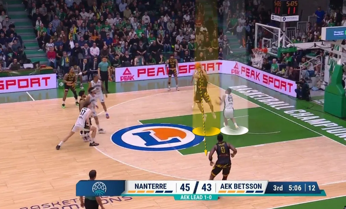 Το δίδυμο των Χέιλ-Χαμπ έχει κουβαλήσει την ΑΕΚ Betsson όλη την σεζόν, αλλά η “Ένωση” είναι στα καλύτερά της όταν βάζουν τα σουτ και οι υπόλοιποι παίκτες. Στο Game 2 αυτό δεν έγινε, με την Ναντέρ να επιλέγει να δώσει το σουτ σε παίκτες όπως ο Γκρέι, ο Φλιώνης, ο Τάκερ και ο Νετζήπογλου, ακόμα και ο Μπράις και να ζήσει με αυτό. Αυτοί οι 5 παίκτες είχαν μαζί 1/7 τρίποντα, κάτι που “πλήγωσε” την “Ένωση”. Ιδού ένα παράδειγμα:
