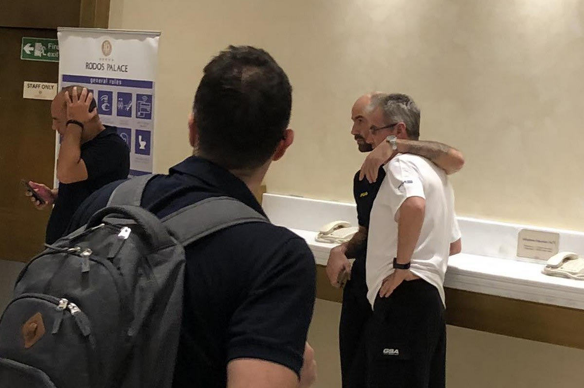 Αντίπαλοι πλέον, αλλά πάντα φίλοι, ο Ανδρέας Γκατζούλης κι ο Βασίλης Σπανούλης ήταν αγκαλιά πριν από τη συνέντευξη Τύπου του Super Cup της Ρόδου.